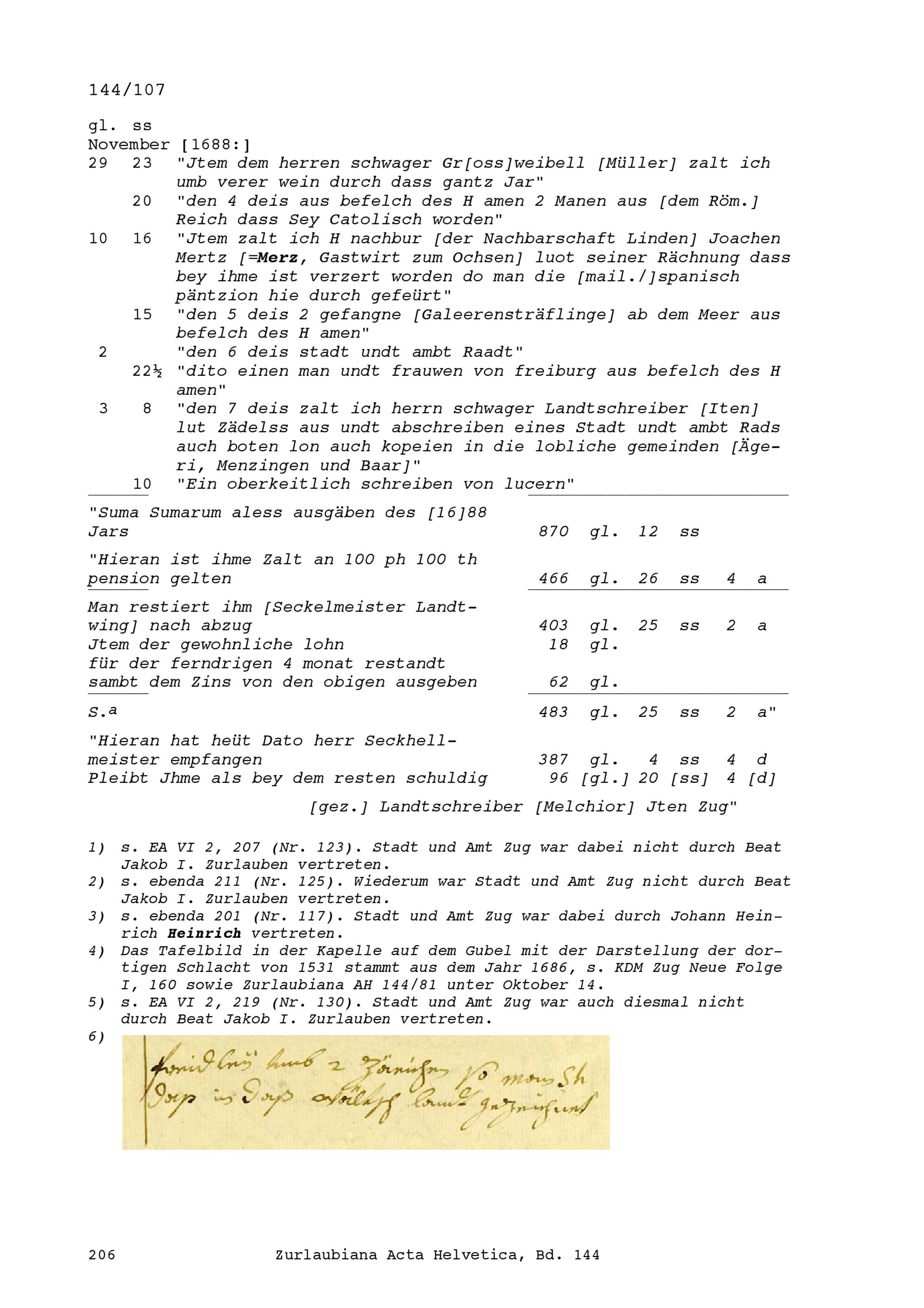 Rechnung der Einnahmen und Ausgaben von Johann Landtwing, Seckelmeister der Stadt Zug, angefangen 16. Oktober 1687
