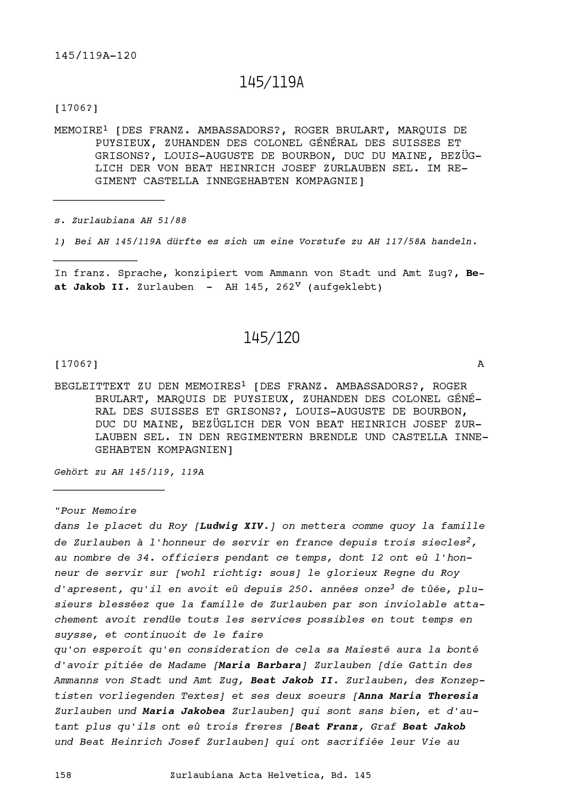 Notiz von Roger Brûlart, Marquis de Puysieux, Ambassador von Frankreich, zuhanden von Louis-Auguste de Bourbon, Duc du Maine, Generaloberst der Schweizer und Bündner, bezüglich der von Beat Heinrich Josef Zurlauben, selig, im Regiment Castella innegehabten Kompanie