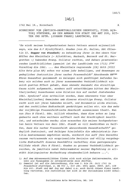 Schreiben von Fidel Anton Püntener, äbtisch-sankt-gallischer Obervogt, an Johann Franz Landtwing, Ammann von Stadt und Amt Zug und Hauptmann, Zug
