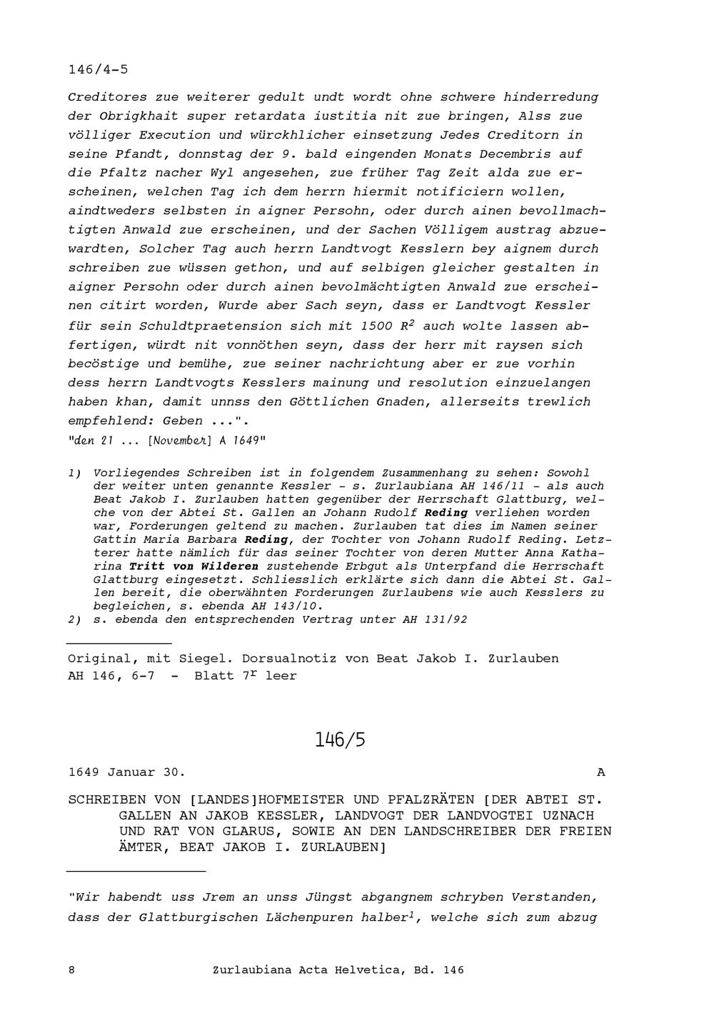 Schreiben des Landeshofmeisters und der Pfalzräte der Abtei Sankt Gallen an Jakob Kessler, Landvogt der Landvogtei Uznach und Rat Glarus, sowie an Beat Jakob I. Zurlauben, Landschreiber der Freien Ämter
