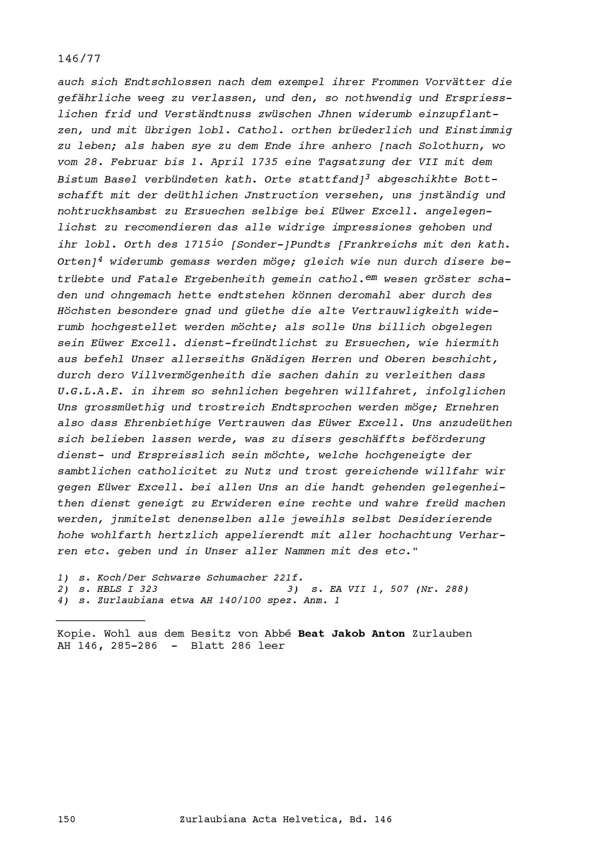 Schreiben der Sechs Katholischen Orte an Jean-Louis d'Usson, Marquis de Bonnac, Ambassador von Frankreich