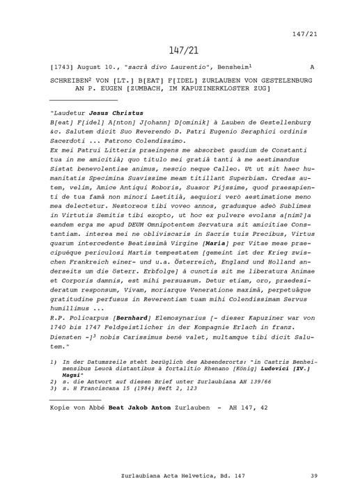 Schreiben von Beat Fidel Zurlauben, Leutnant, an Eugen Zumbach, Kapuzinerpater im Kapuzinerkloster Zug