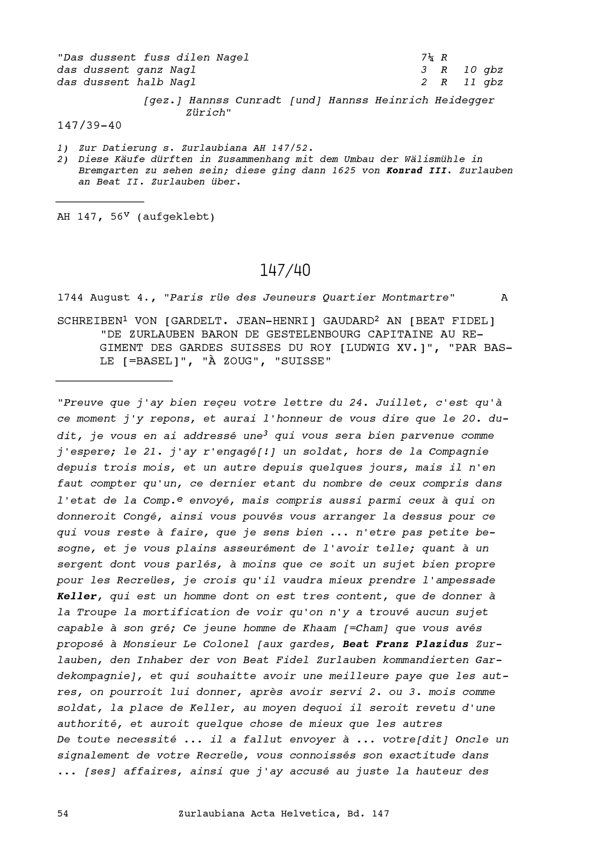 Schreiben von Jean-Henri Gaudard, Gardeleutnant, an Beat Fidel Zurlauben Hauptmann im Regiment der Schweizer Garden, Zug
