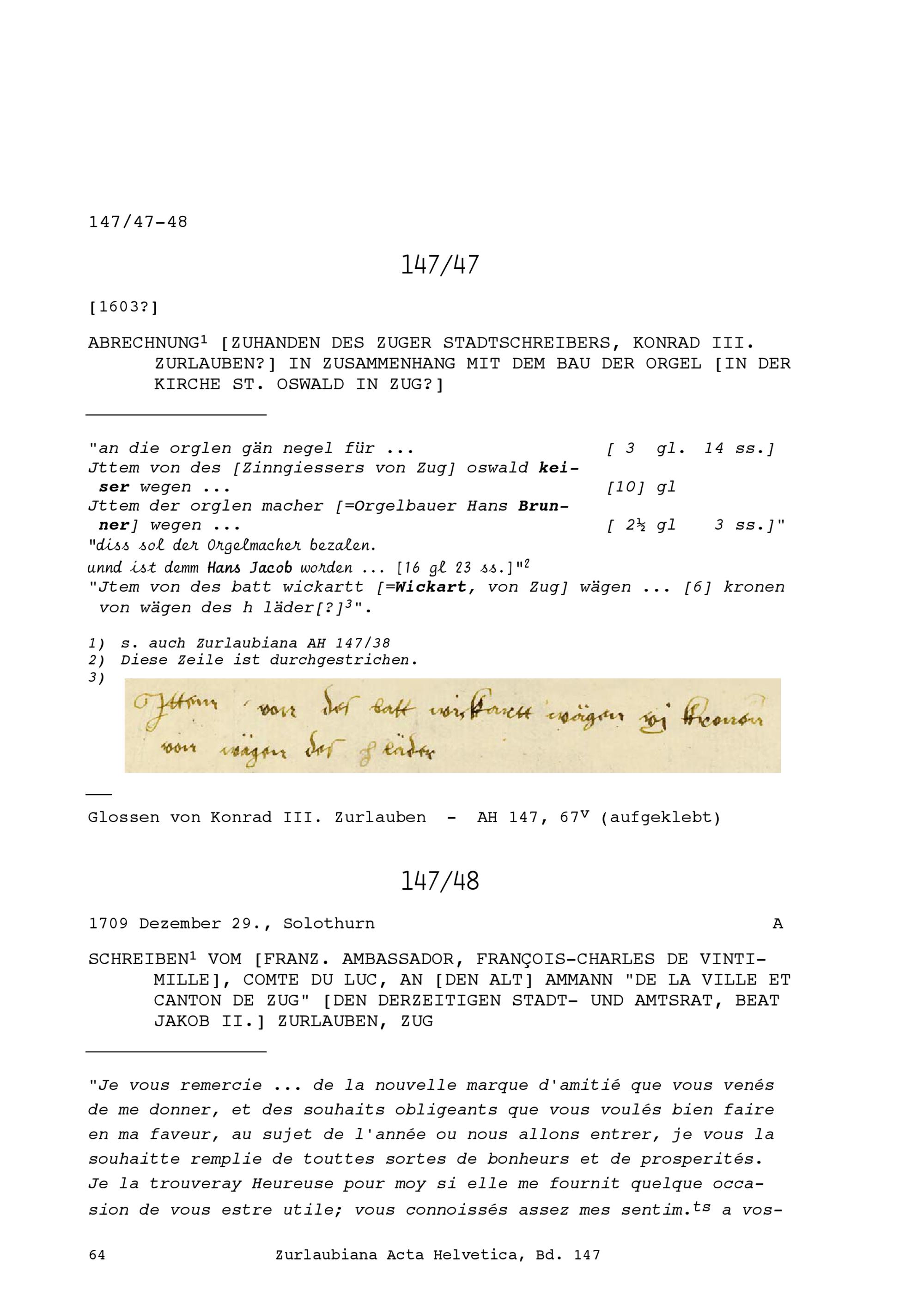 Abrechnung zuhanden von Konrad III. Zurlauben, Zuger Stadtschreiber, in Zusammenhang mit dem Bau der Orgel in der Kirche Sankt Oswald in Zug