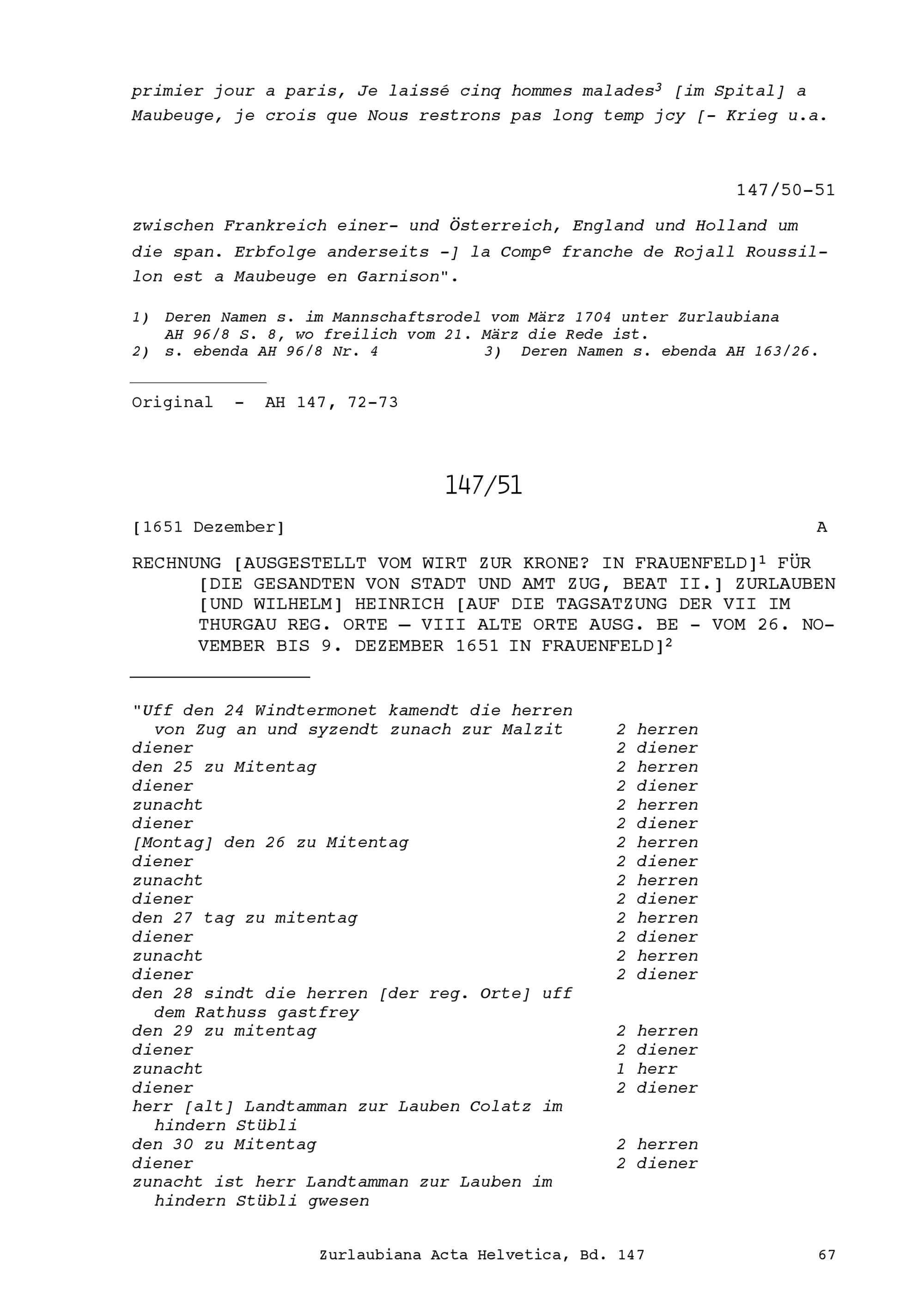 Rechnung für Beat II. Zurlauben, Gesandter von Stadt und Amt Zug, und für Wilhelm Heinrich, Gesandter von Stadt und Amt Zug, an der Tagsatzung der Sieben im Thurgau regierenden Orte in Frauenfeld vom 26. November bis 9. Dezember 1651, ausgestellt vom Wirt zur Krone in Frauenfeld
