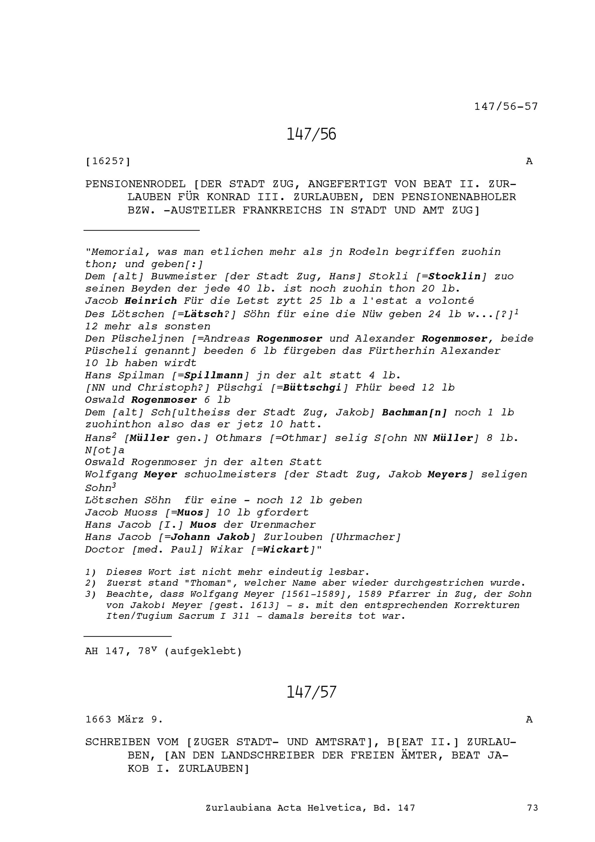 Pensionenrodel der Stadt Zug, angefertigt von Beat II. Zurlauben für Konrad III....