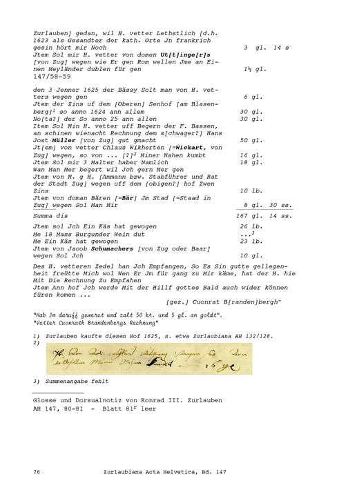 Abrechnung von Konrad Brandenberg, Seckelmeister der Stadt Zug, mit Konrad III. Zurlauben