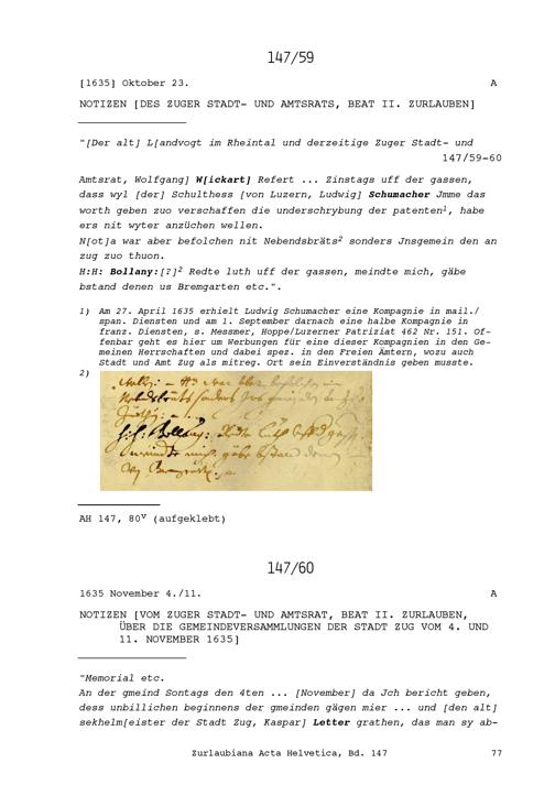 Notiz von Beat II. Zurlauben, Stadt- und Amtrat Zug
