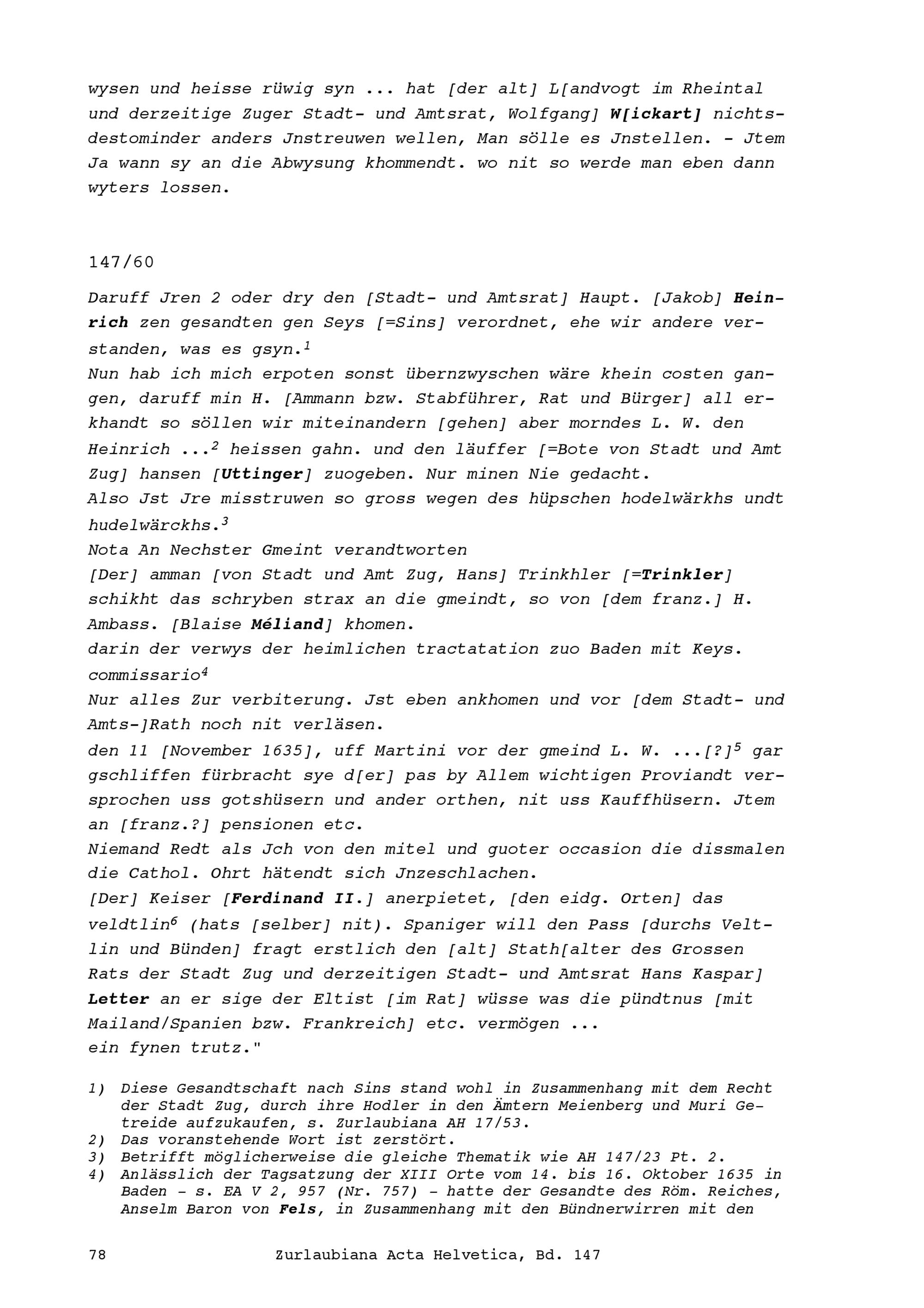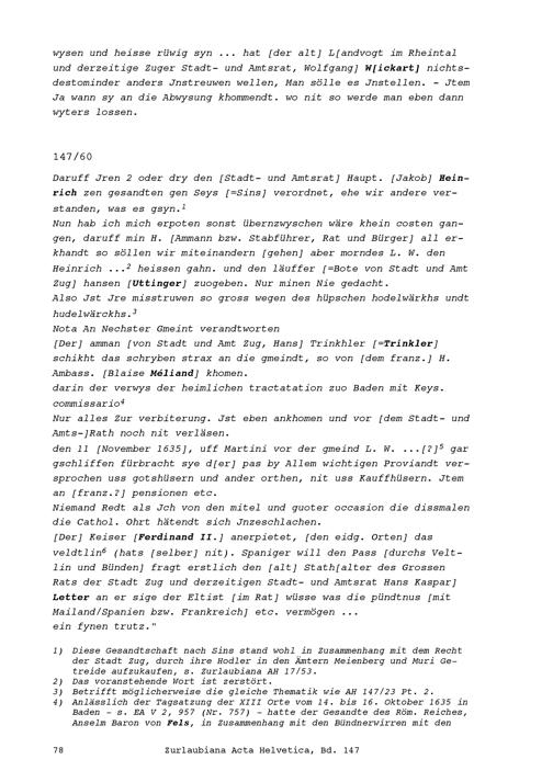 Notiz von Beat II. Zurlauben, Stadt- und Amtrat Zug, über die Gemeindeversammlungen der Stadt Zug vom 4. und 11. November 1635
