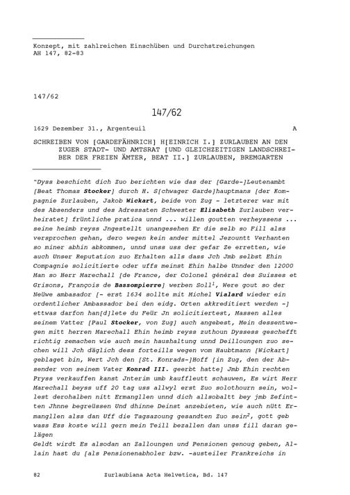 Schreiben von Heinrich I. Zurlauben, Gardefähnrich, an Beat II. Zurlauben, Stadt- und Amtrat Zug und Landschreiber der Freien Ämter, Bremgarten