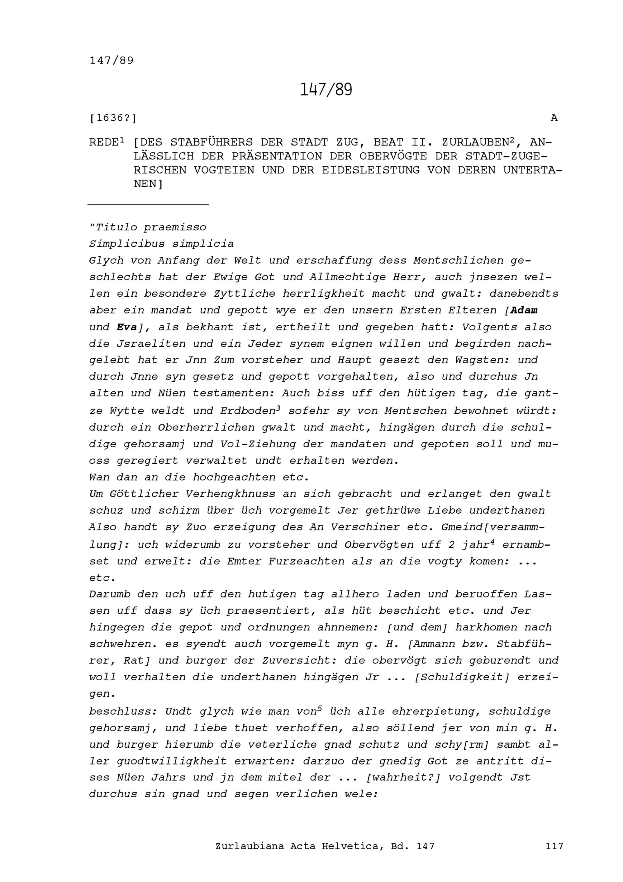 Rede von Beat II. Zurlauben, Stabführer der Stadt Zug, anlässlich der Präsentation der Obervögte der Zuger Vogteien und der Eidesleistung von deren Untertanen