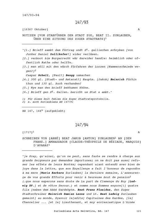 Notiz von Beat II. Zurlauben, Stabführer der Stadt Zug, über eine Sitzung des Stadtrats...