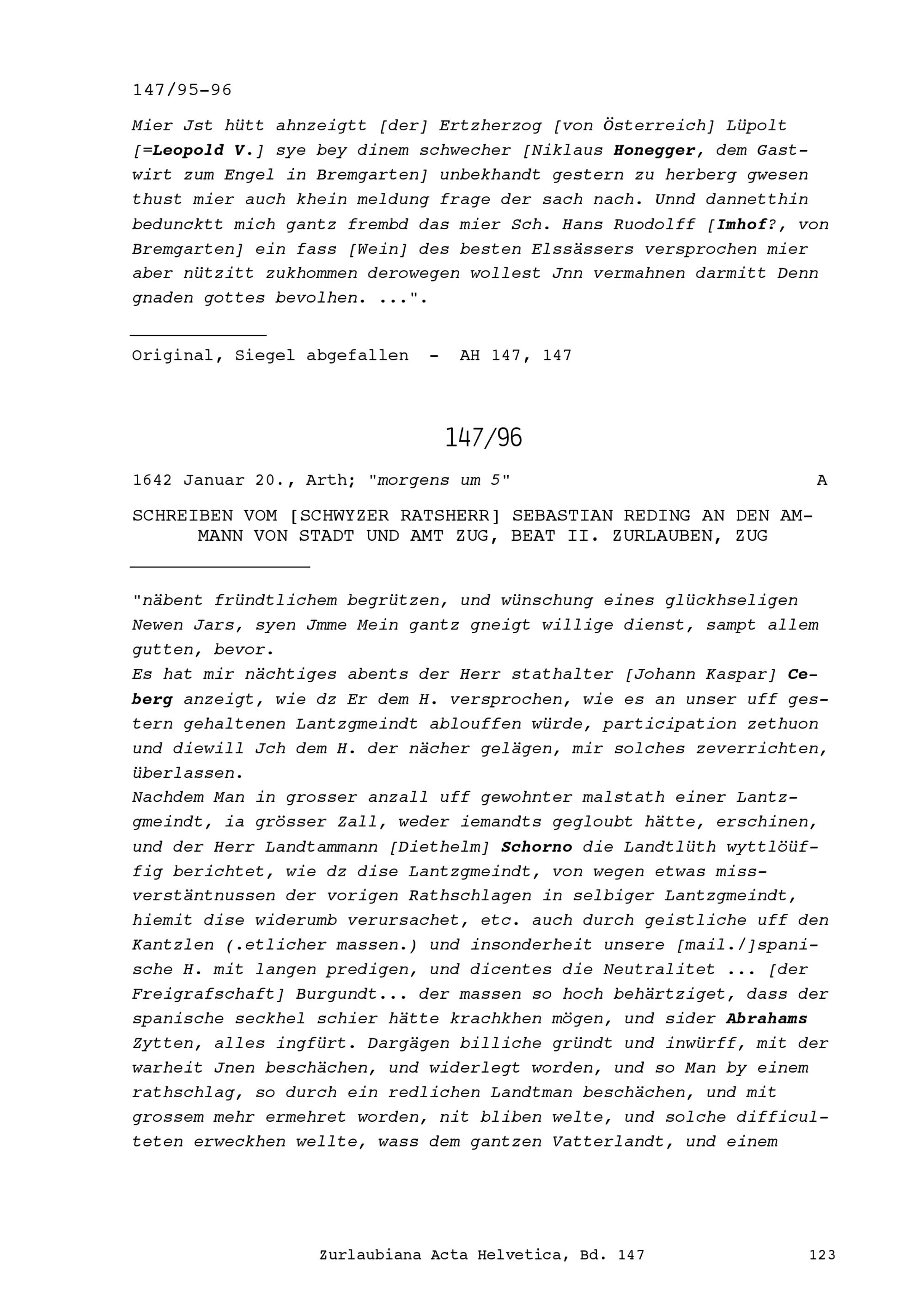 Schreiben von Sebastian Reding, Ratsherr Schwyz, an Beat II. Zurlauben, Ammann von Stadt und Amt Zug, Zug