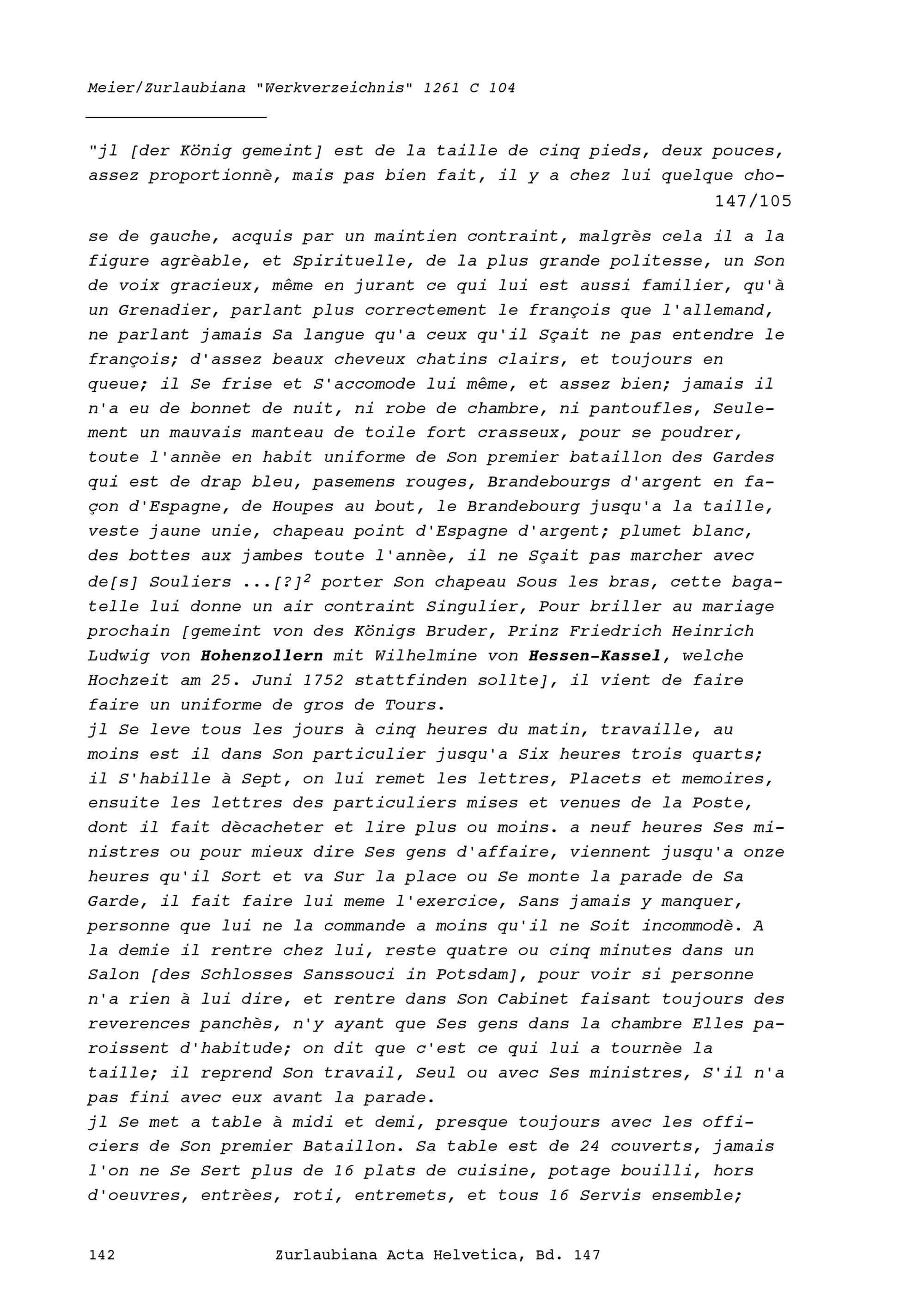 Beschreibung von Friedrich II. der Grosse, König von Brandenburg-Preussen, der Person und der des höfischen Umfelds, aufgezeichnet von Beat Fidel Zurlauben, Gardehauptmann und Brigadier