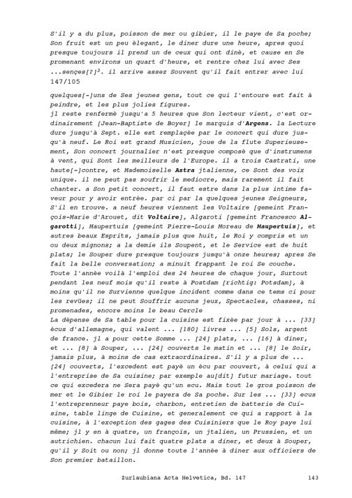 Beschreibung von Friedrich II. der Grosse, König von Brandenburg-Preussen, der Person und der des höfischen Umfelds, aufgezeichnet von Beat Fidel Zurlauben, Gardehauptmann und Brigadier