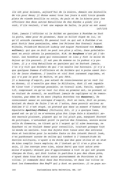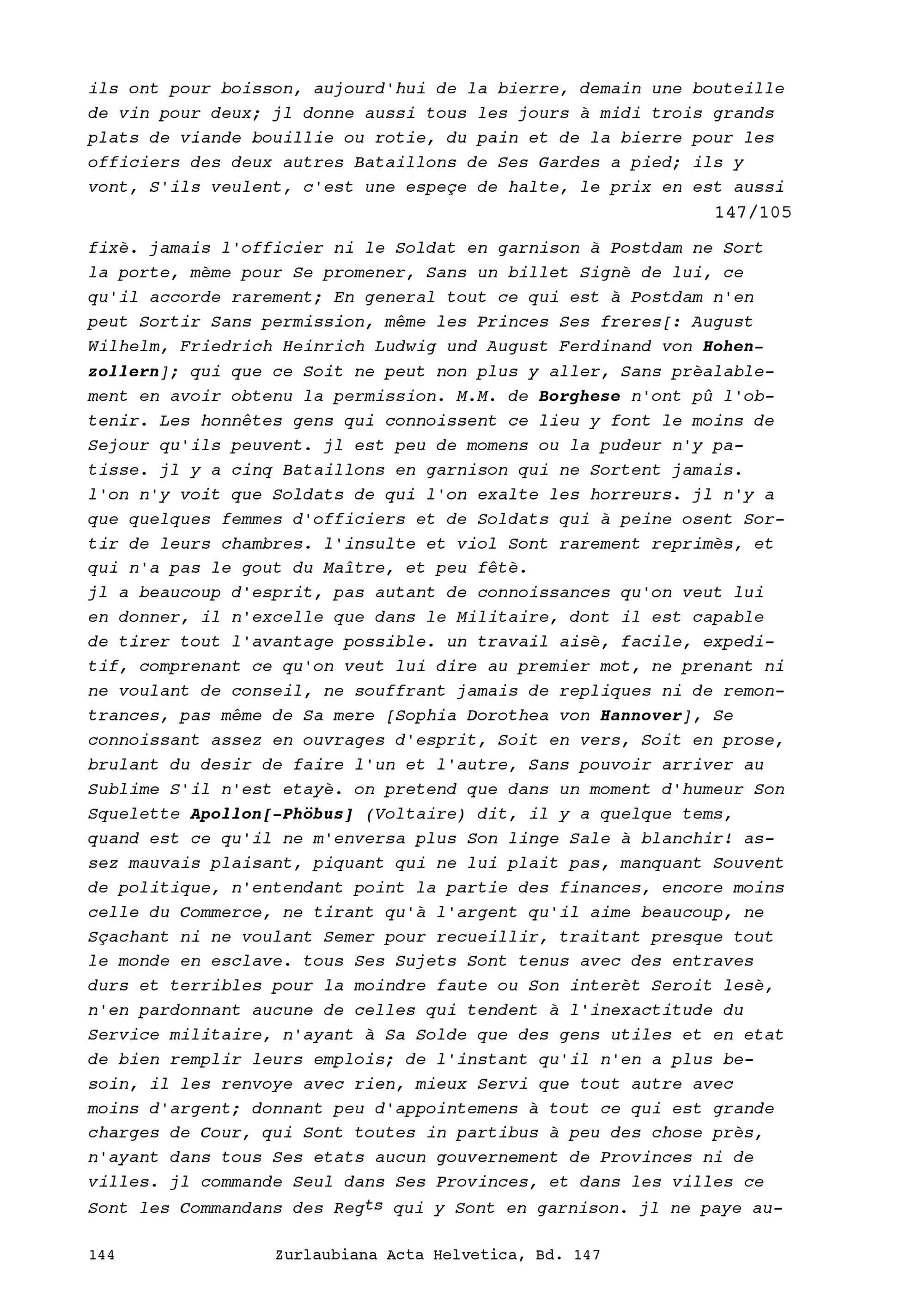 Beschreibung von Friedrich II. der Grosse, König von Brandenburg-Preussen, der Person und der des höfischen Umfelds, aufgezeichnet von Beat Fidel Zurlauben, Gardehauptmann und Brigadier