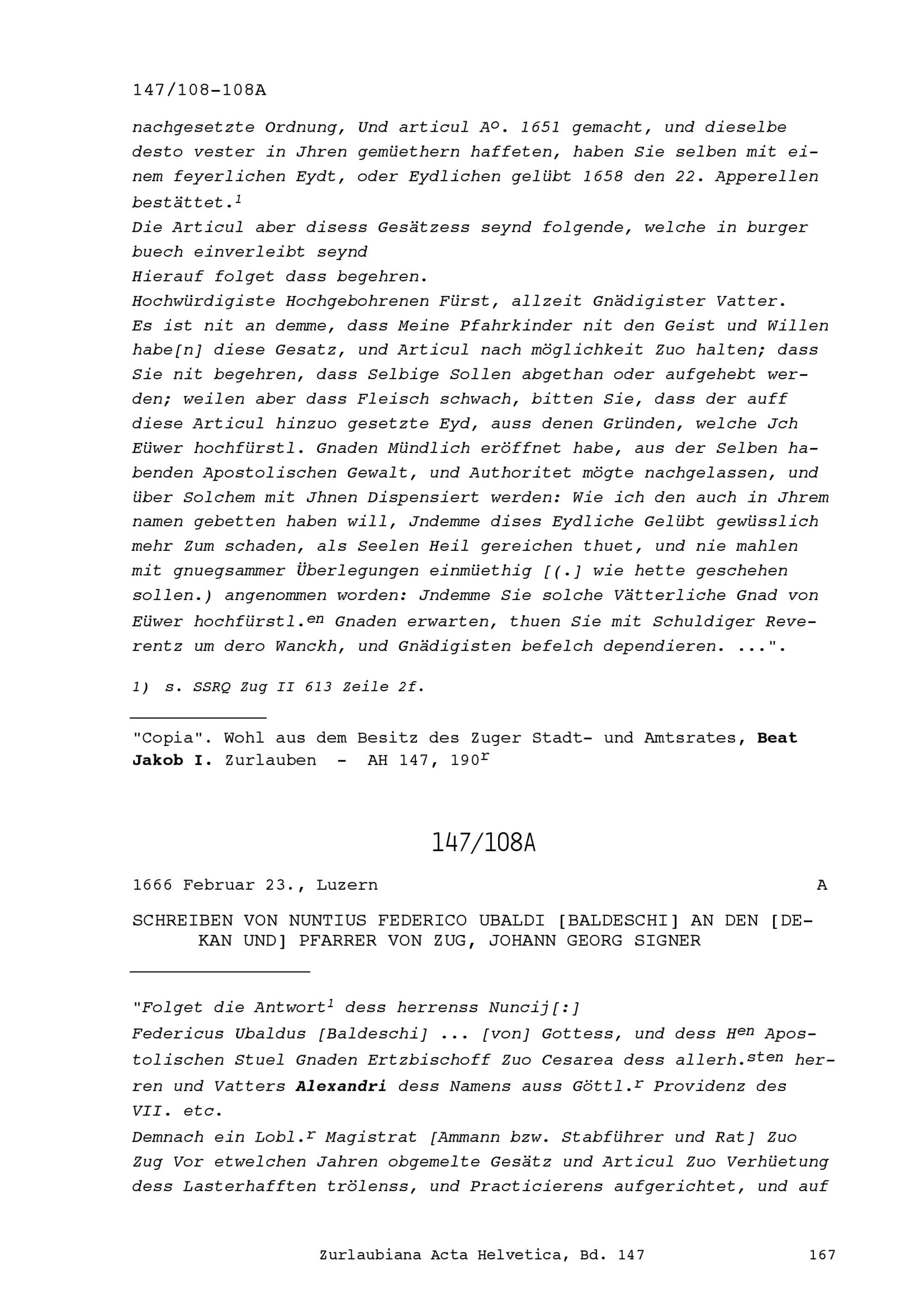 Schreiben von Federico Ubaldi Baldeschi, Nuntius, an Johann Georg Signer, Dekan und Pfarrer von Zug