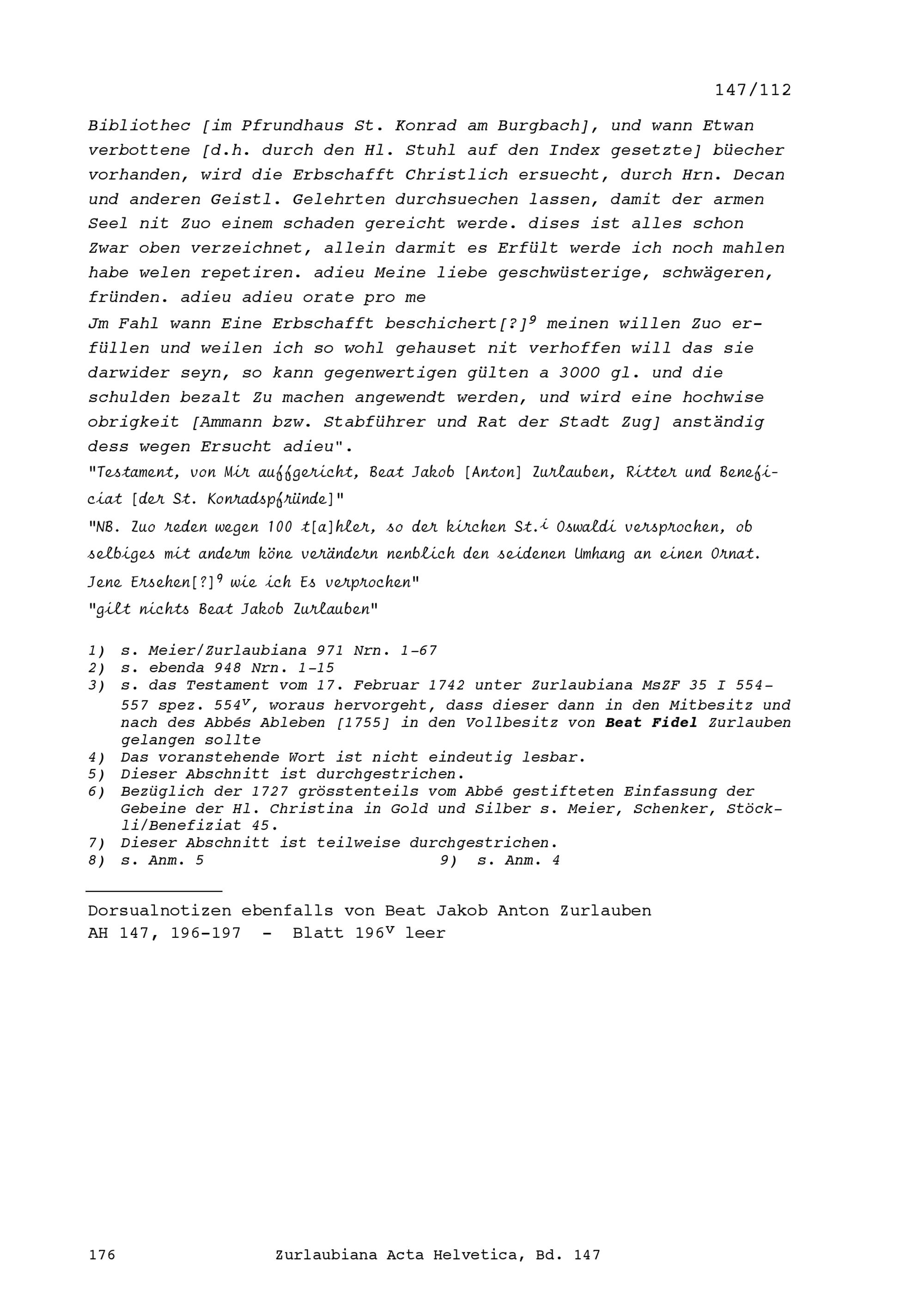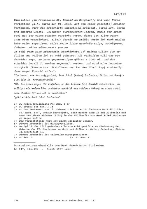 Testament mit eigenhändige Anmerkungen von Beat Jakob Anton Zurlauben, Benefiziat der Sankt Konradspfrund in Zug