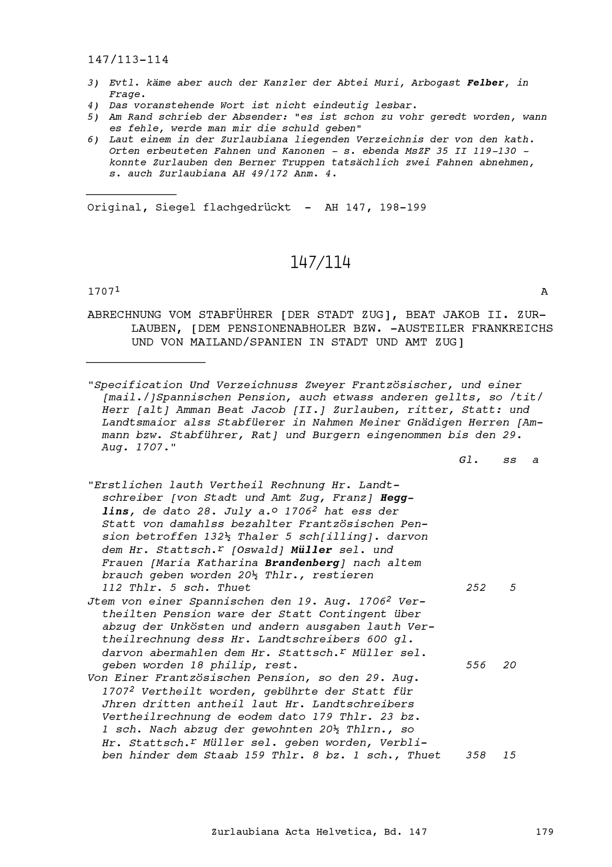 Abrechnung von Beat Jakob II. Zurlauben, Stabführer der Stadt Zug, Pensionenabholer und Pensionenausteiler Frankreichs und von Mailand-Spanien in Stadt und Amt Zug