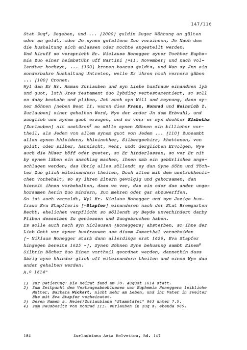 Ehevertrag zwischen Beat II. Zurlauben, von Zug, und Euphemia Honegger, von Bremgarten