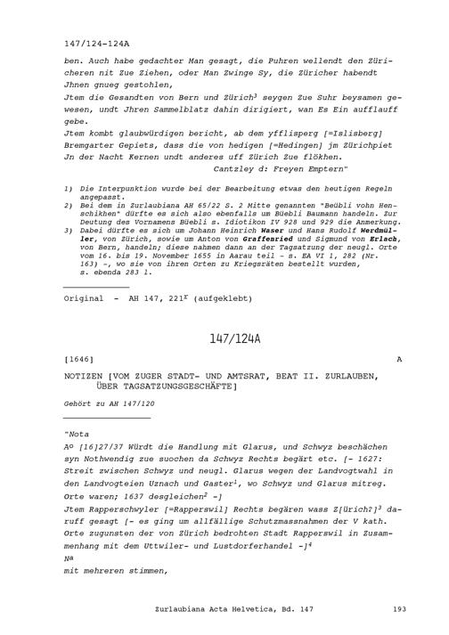 Notiz von Beat II. Zurlauben, Stadt- und Amtrat Zug, über Tagsatzungsgeschäfte