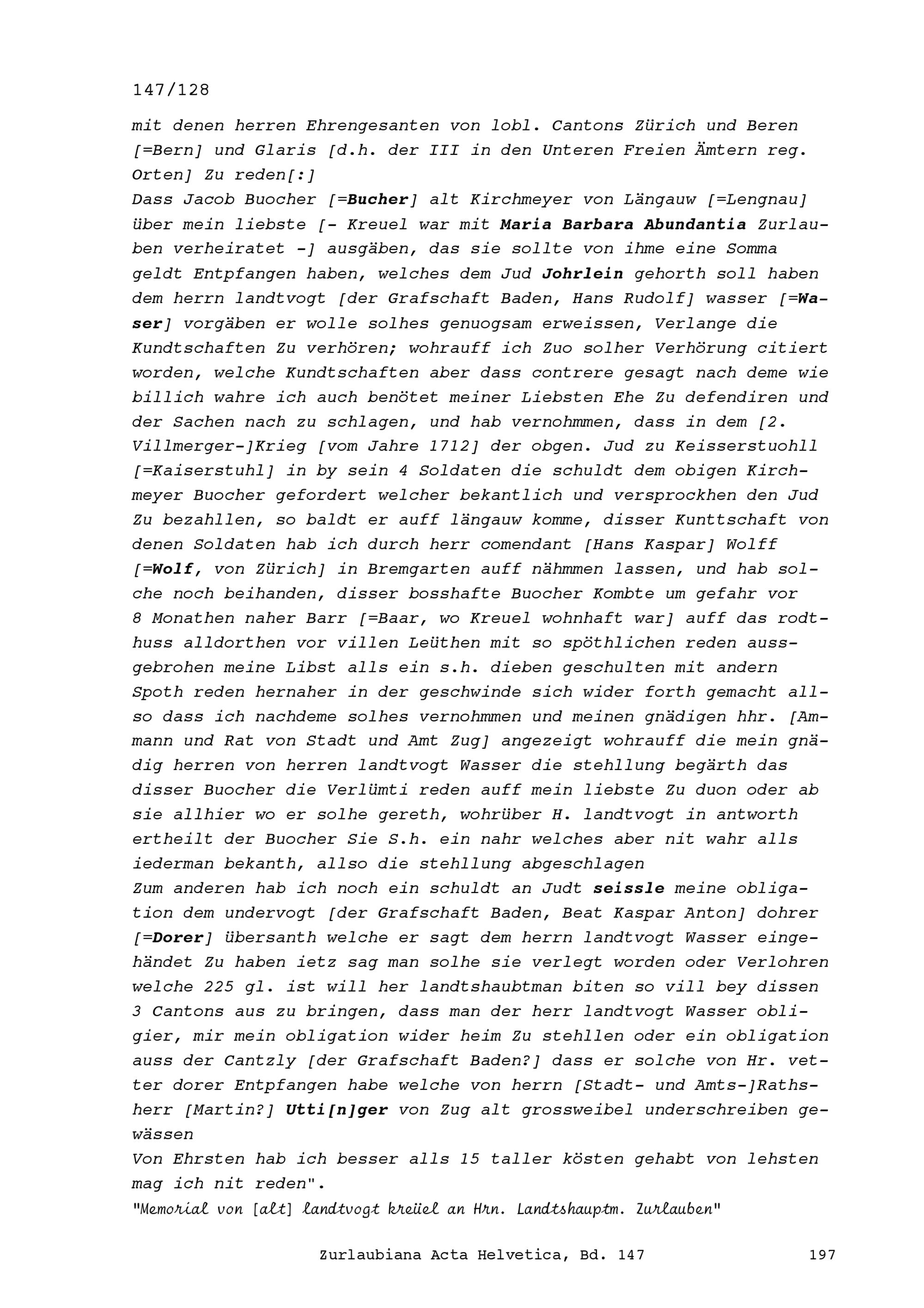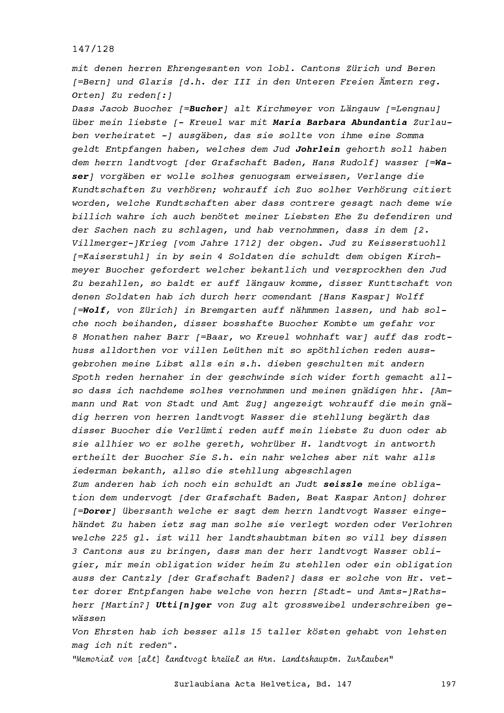 Bericht von Johann Rudolf Kreuel, Altlandvogt der Grafschaft Baden, zuhanden von Fidel Zurlauben, Landeshauptmann der Oberen Freien Ämter