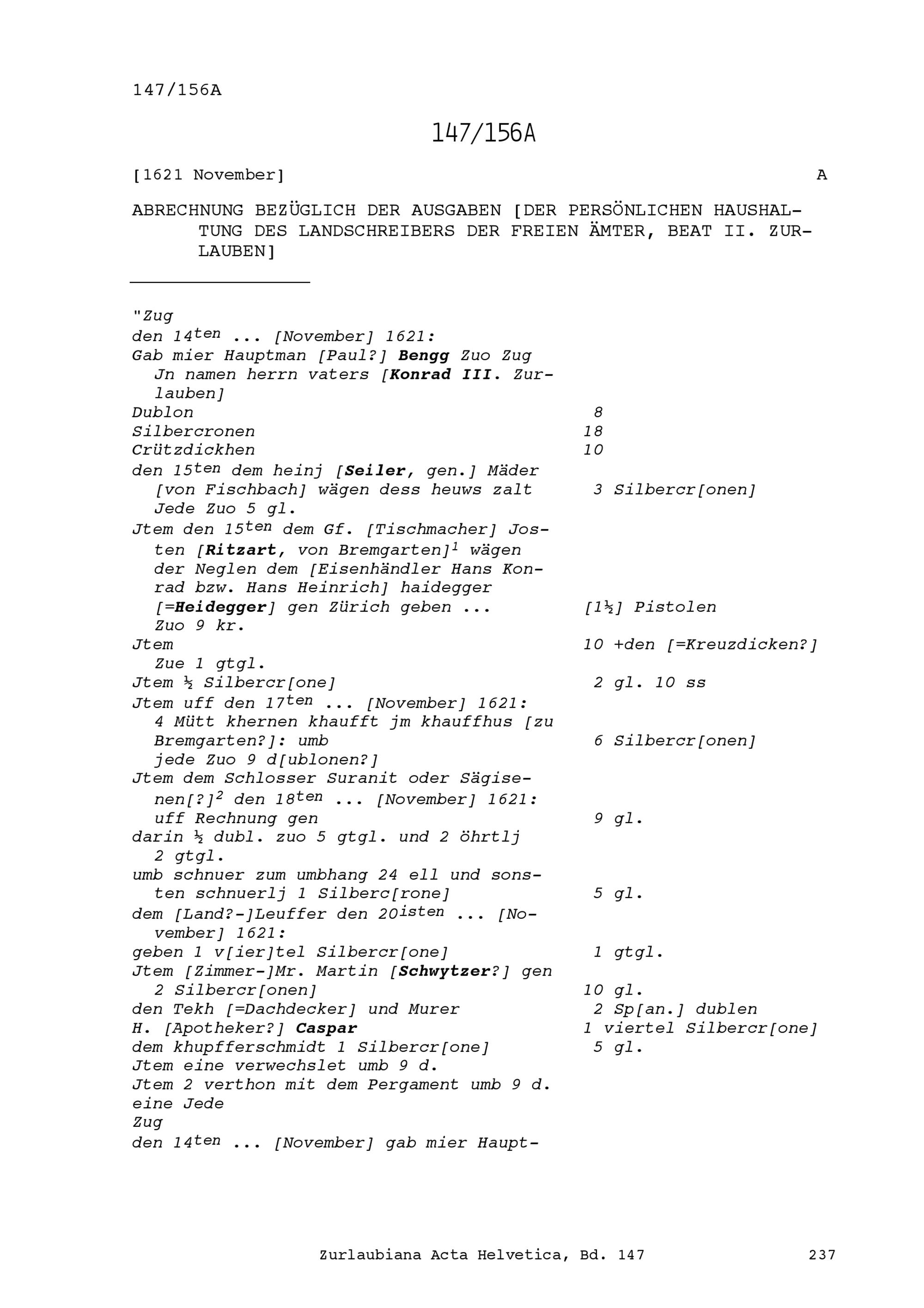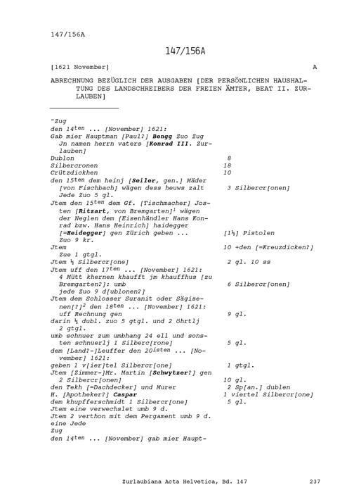 Abrechnung bezüglich der Ausgaben der persönlichen Haushaltung von Beat II. Zurlauben, Landschreiber der Freien Ämter