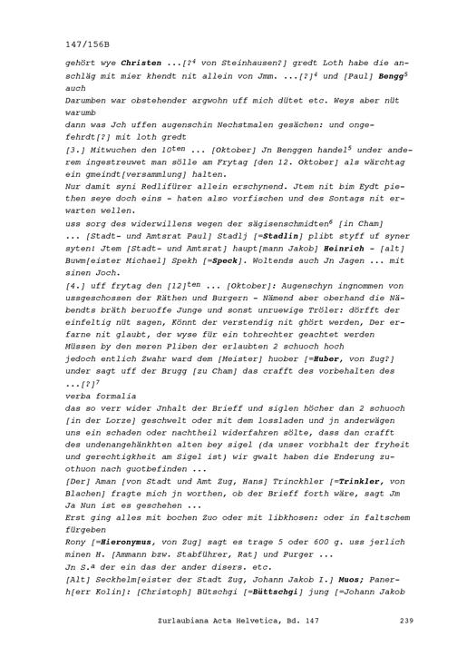 Notiz von Beat II. Zurlauben, Stadt- und Amtrat Zug, unter anderem über die Aktivitäten von Wolfgang Wickart, Stadt- und Amtrat, den Hünenberger Handel sowie die Sensenschmiede in der Zuger Vogtei Cham