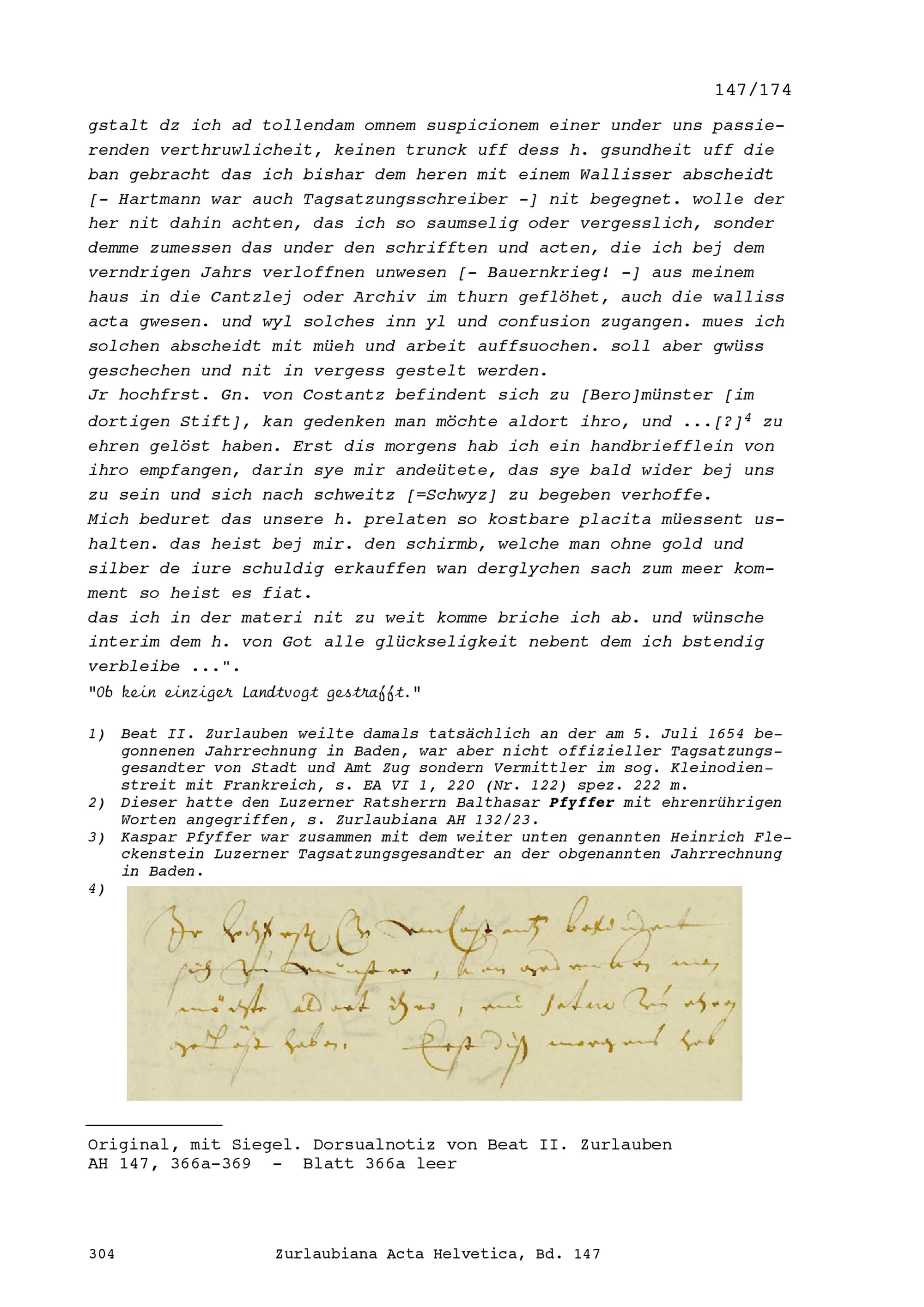 Schreiben von Ludwig Hartmann, Stadtschreiber, an Beat II. Zurlauben, Stadt- und...