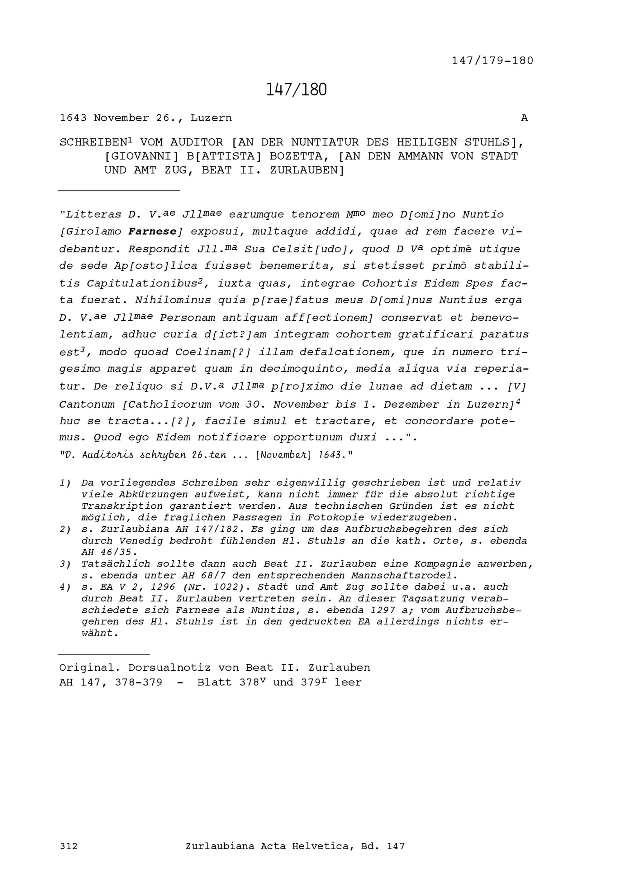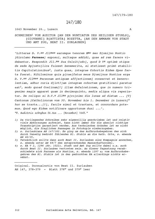 Schreiben von Giovanni Battista Bozetta, Auditor an der Nuntiatur des Heiligen Stuhls, an Beat II. Zurlauben, Ammann