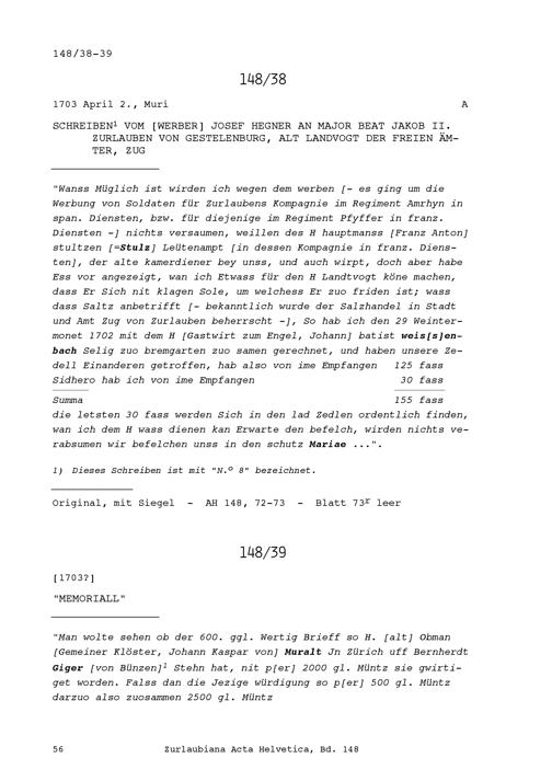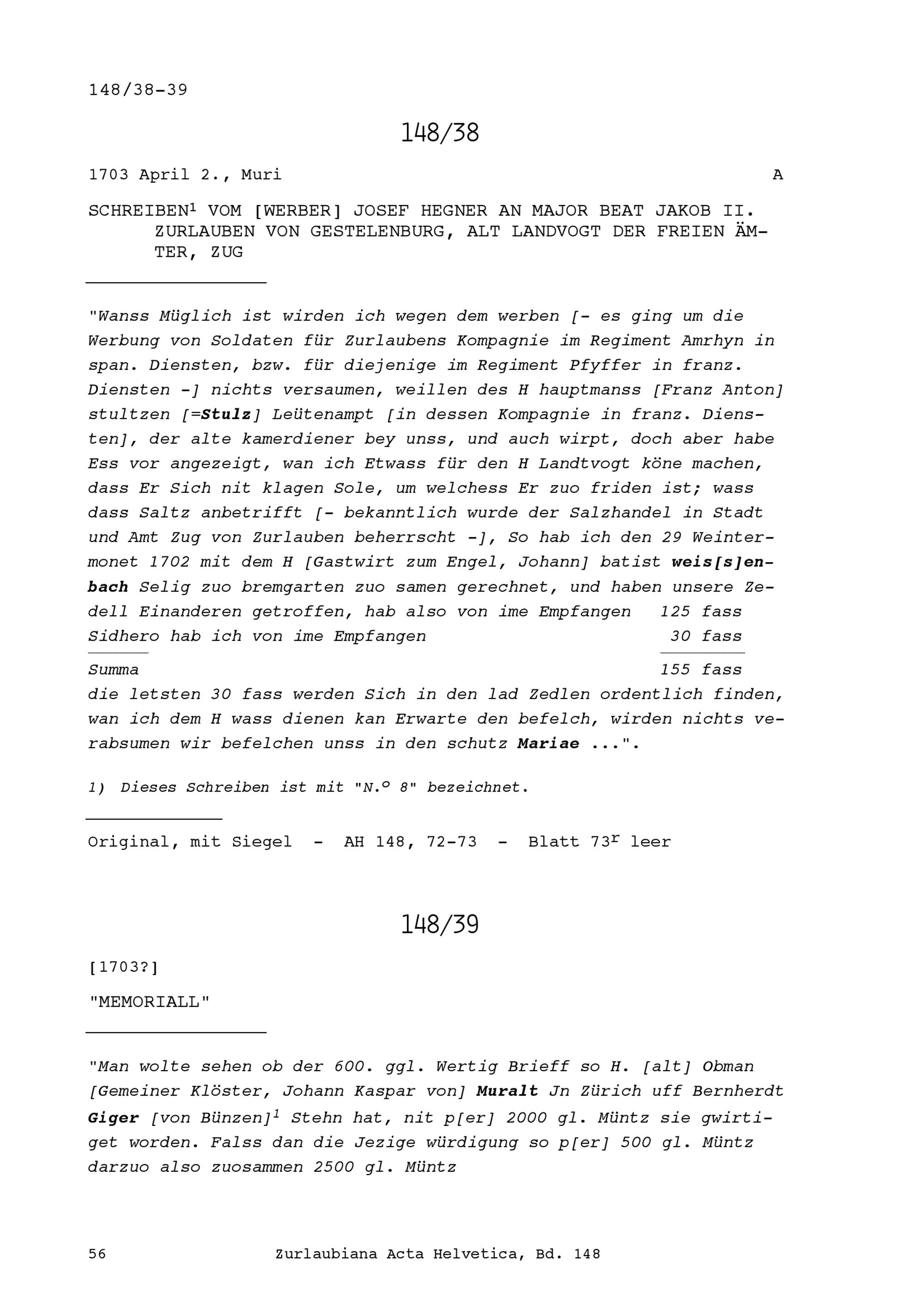 Schreiben von Josef Hegner, Werber, an Beat Jakob II. Zurlauben, Major und Altlandvogt der Freien Ämter, Zug