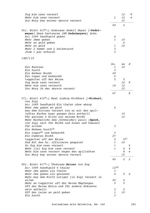 Abrechnung der für die Gardekompanie von Beat Heinrich Josef Zurlauben beziehungsweise die Kompanie von Beat Jakob II. Zurlauben im Regiment Stoppa, beide in französischen Diensten, geworbenen Soldaten