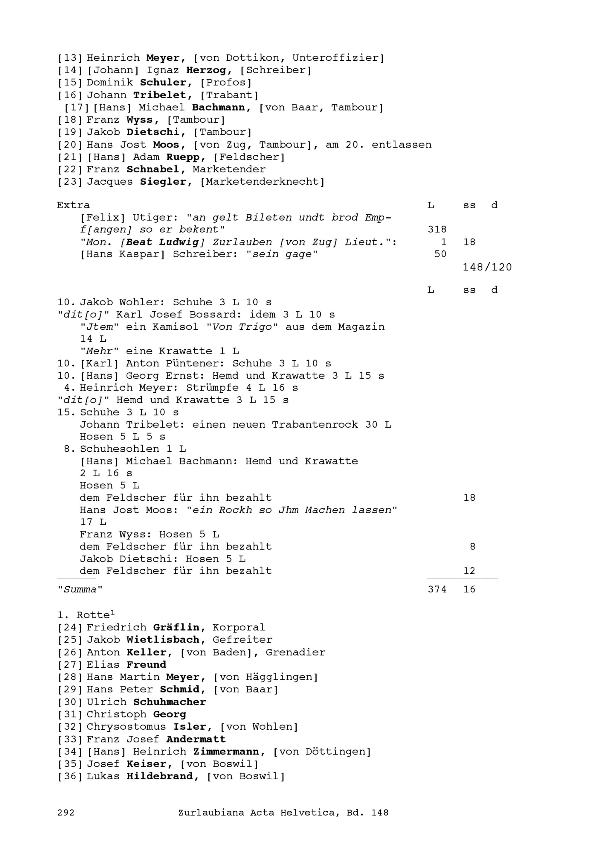 Mannschafts- und Soldrodel der Kompanie von Beat Jakob II. Zurlauben, Hauptmann im Regiment Pfyffer in französischen Diensten, aufgezeichnet von Hans Kaspar Schreiber, Fähnrich, Bapaume