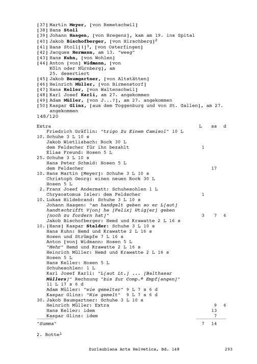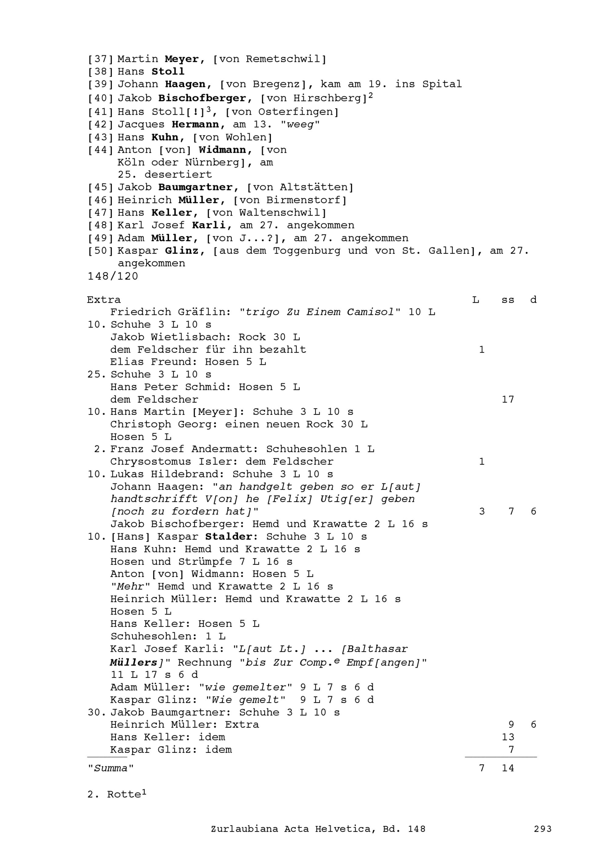 Mannschafts- und Soldrodel der Kompanie von Beat Jakob II. Zurlauben, Hauptmann im Regiment Pfyffer in französischen Diensten, aufgezeichnet von Hans Kaspar Schreiber, Fähnrich, Bapaume