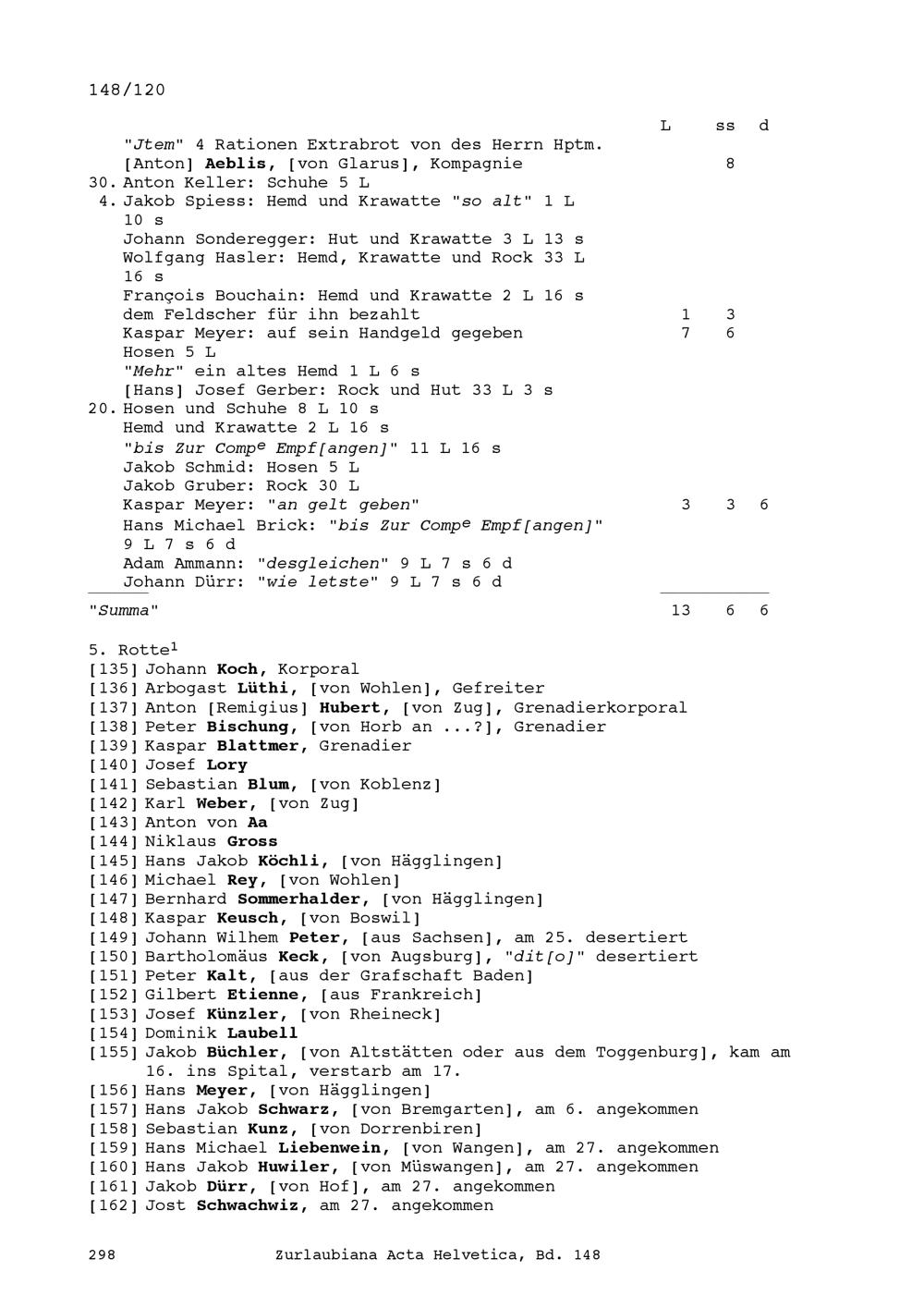 Mannschafts- und Soldrodel der Kompanie von Beat Jakob II. Zurlauben, Hauptmann im Regiment Pfyffer in französischen Diensten, aufgezeichnet von Hans Kaspar Schreiber, Fähnrich, Bapaume
