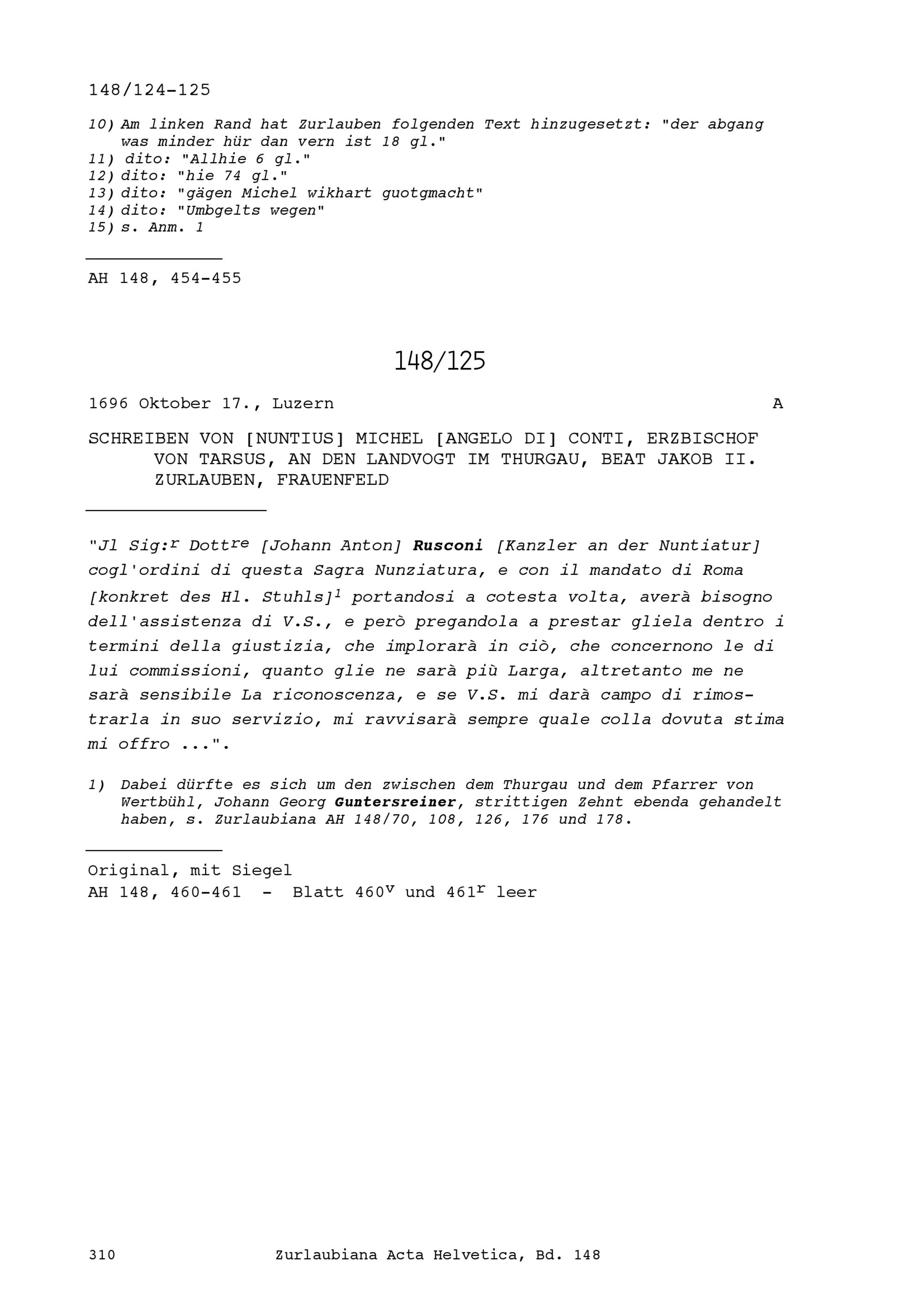 Schreiben von Michel Angelo di Conti, Nuntius und Erzbischof von Tarsus, an Beat Jakob II. Zurlauben, Landvogt im Thurgau, Frauenfeld