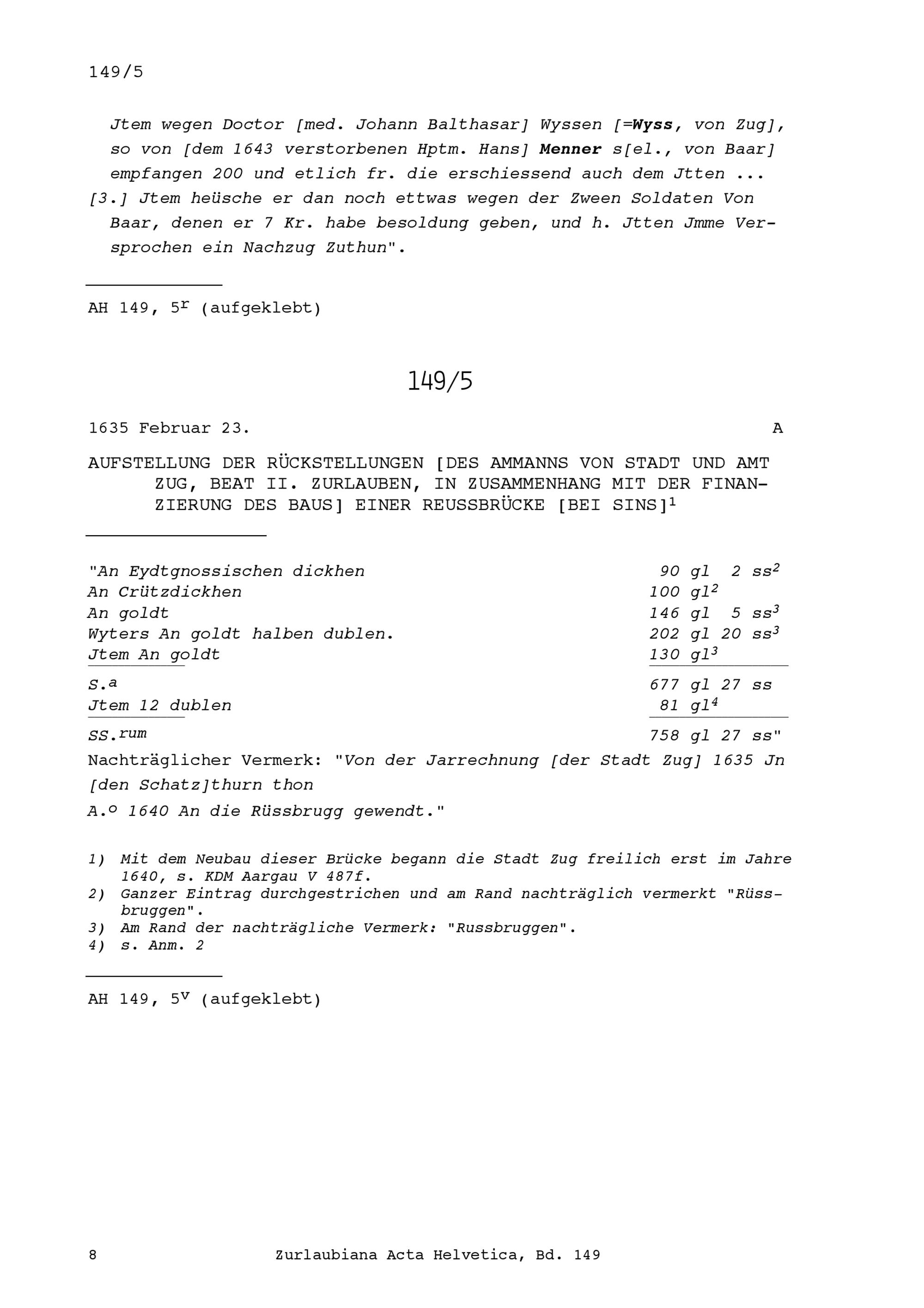 Rückstellungen von Beat II. Zurlauben, Ammann von Stadt und Amt Zug, in Zusammenhang mit der Finanzierung des Baus der Reussbrücke bei Sins