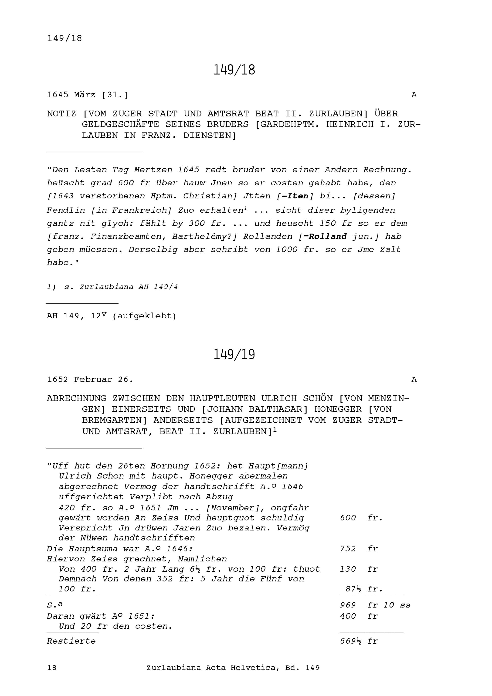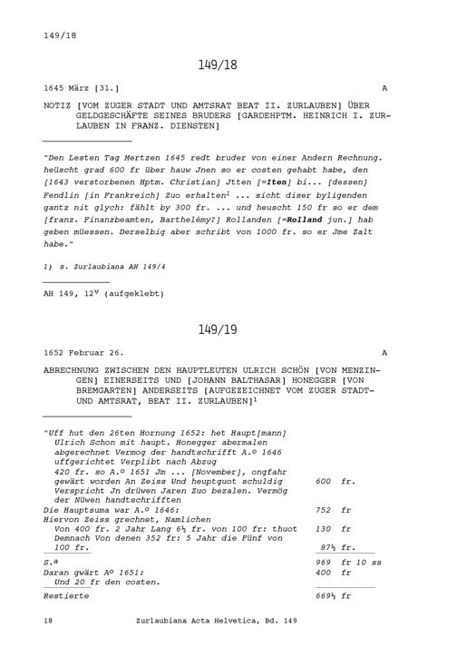 Notiz von Beat II. Zurlauben, Stadt- und Amtrat Zug, über Geldgeschäfte von Heinrich...