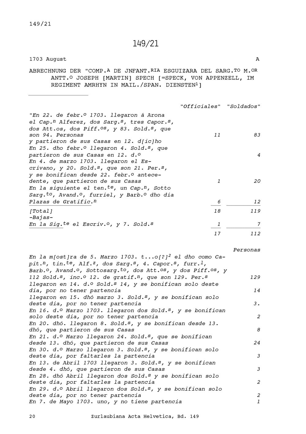 Abrechnung der Kompanie von Josef Martin Speck, von Appenzell, im Regiment Amrhyn in mailändisch-spanischen Diensten