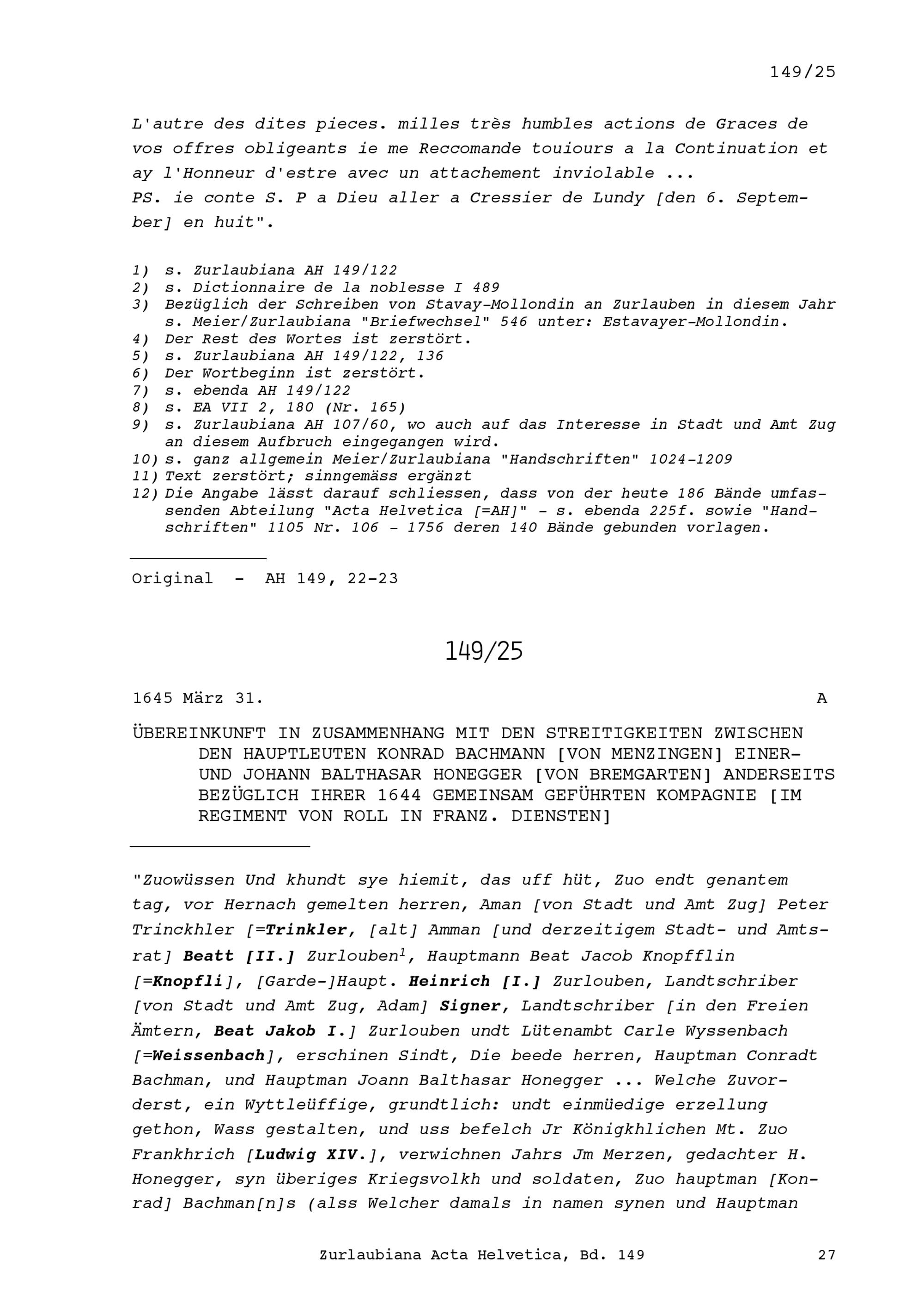 Übereinkunft in Zusammenhang mit den Streitigkeiten zwischen Konrad Bachmann, Hauptmann, von Menzingen, einerseits und Johann Balthasar Honegger, Hauptmann, von Bremgarten anderseits bezüglich ihrer 1644 gemeinsam geführten Kompanie im Regiment von Roll in französischen Diensten