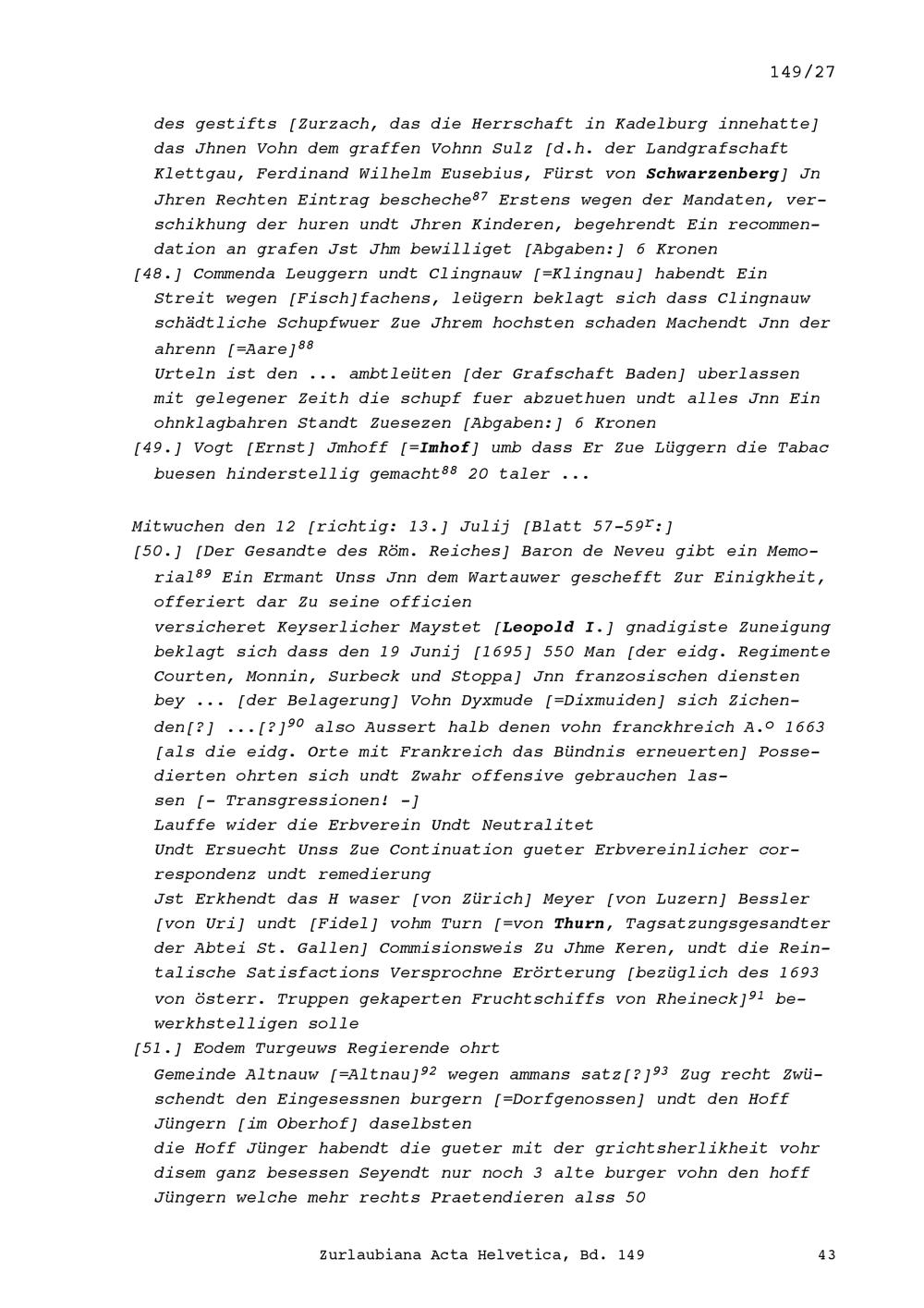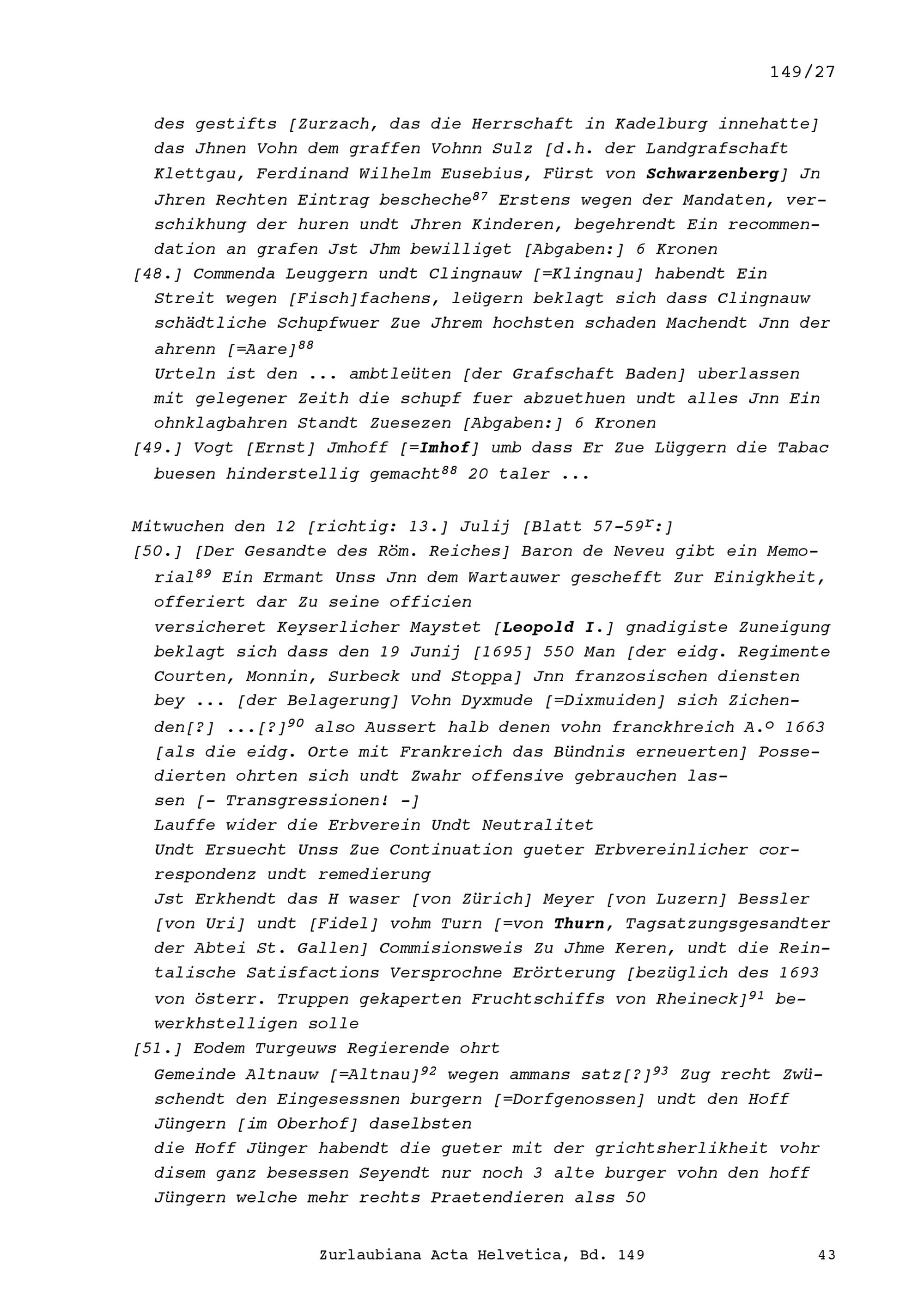 Notiz von Beat Kaspar Zurlauben, Tagsatzungsgesandter von Stadt und Amt Zug, über die am 4. Juli 1695 in Baden begonnene Jahrrechnung