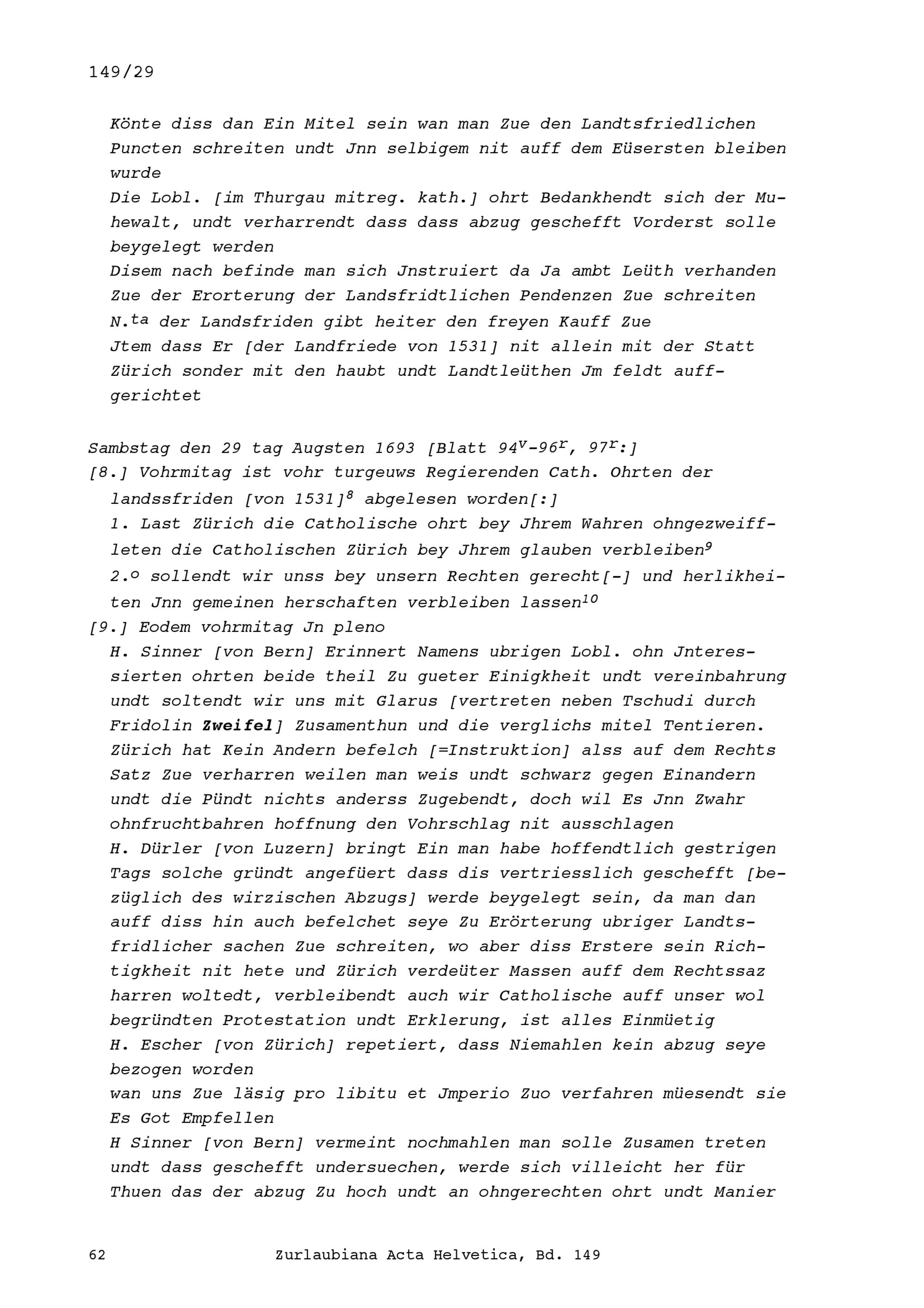Notiz von Beat Kaspar Zurlauben, Tagsatzungsgesandter von Stadt und Amt Zug, über die Tagsatzung der Dreizehn Orte in Baden vom 26. August bis 6. September 1693