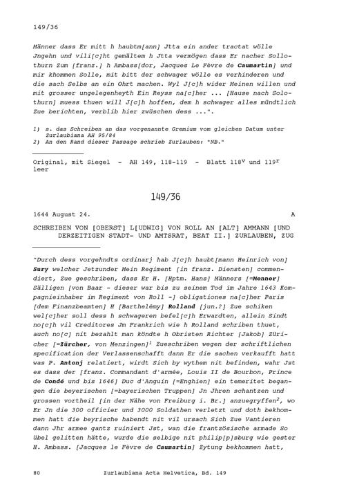 Schreiben von Ludwig von Roll, Oberst, an Beat II. Zurlauben, Altammann und Stadt-...