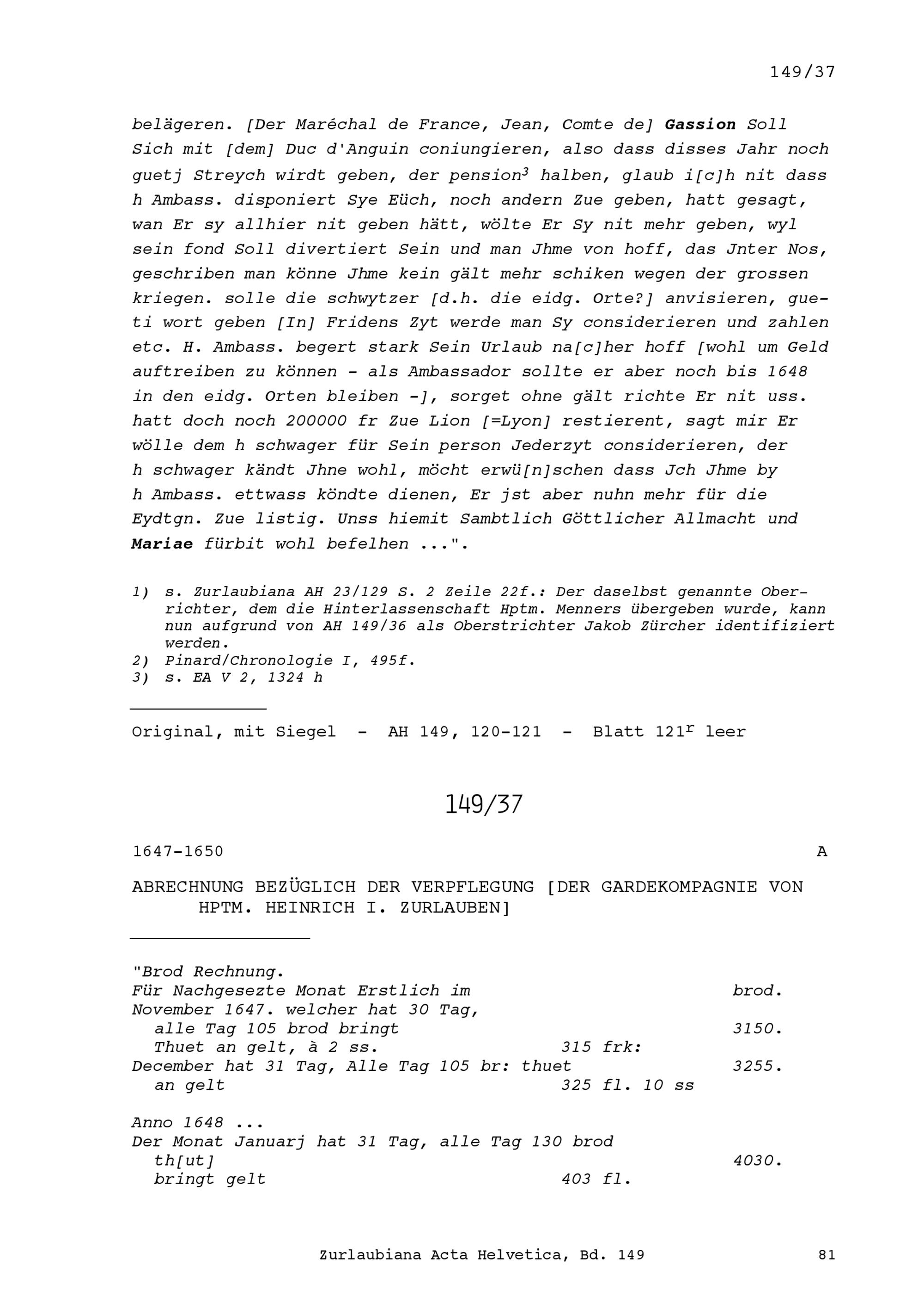 Abrechnung bezüglich der Verpflegung der Gardekompanie von Heinrich I. Zurlauben, Hauptmann