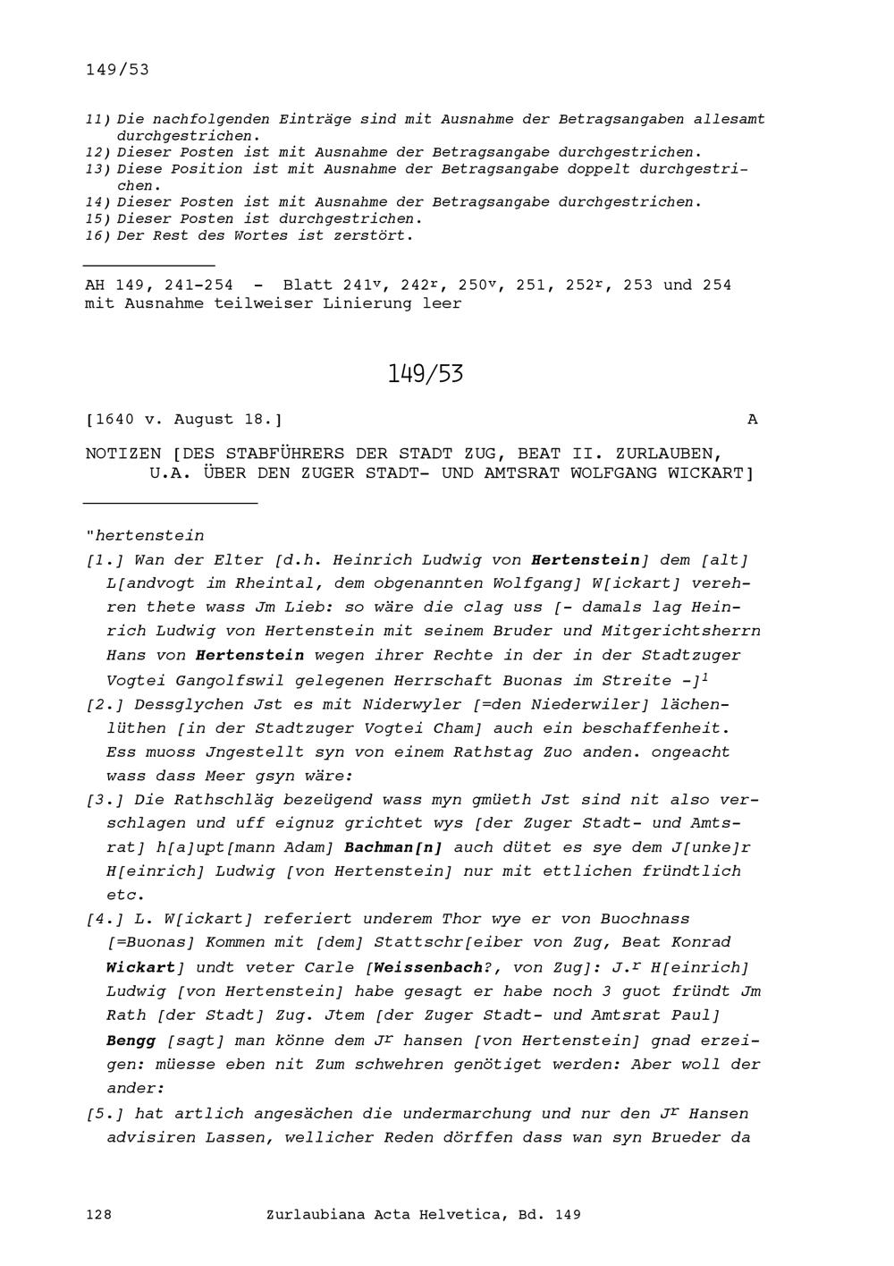 Notiz von Beat II. Zurlauben, Stabführer der Stadt Zug, unter anderem über Wolfgang Wickart, Stadt- und Amtrat Zug