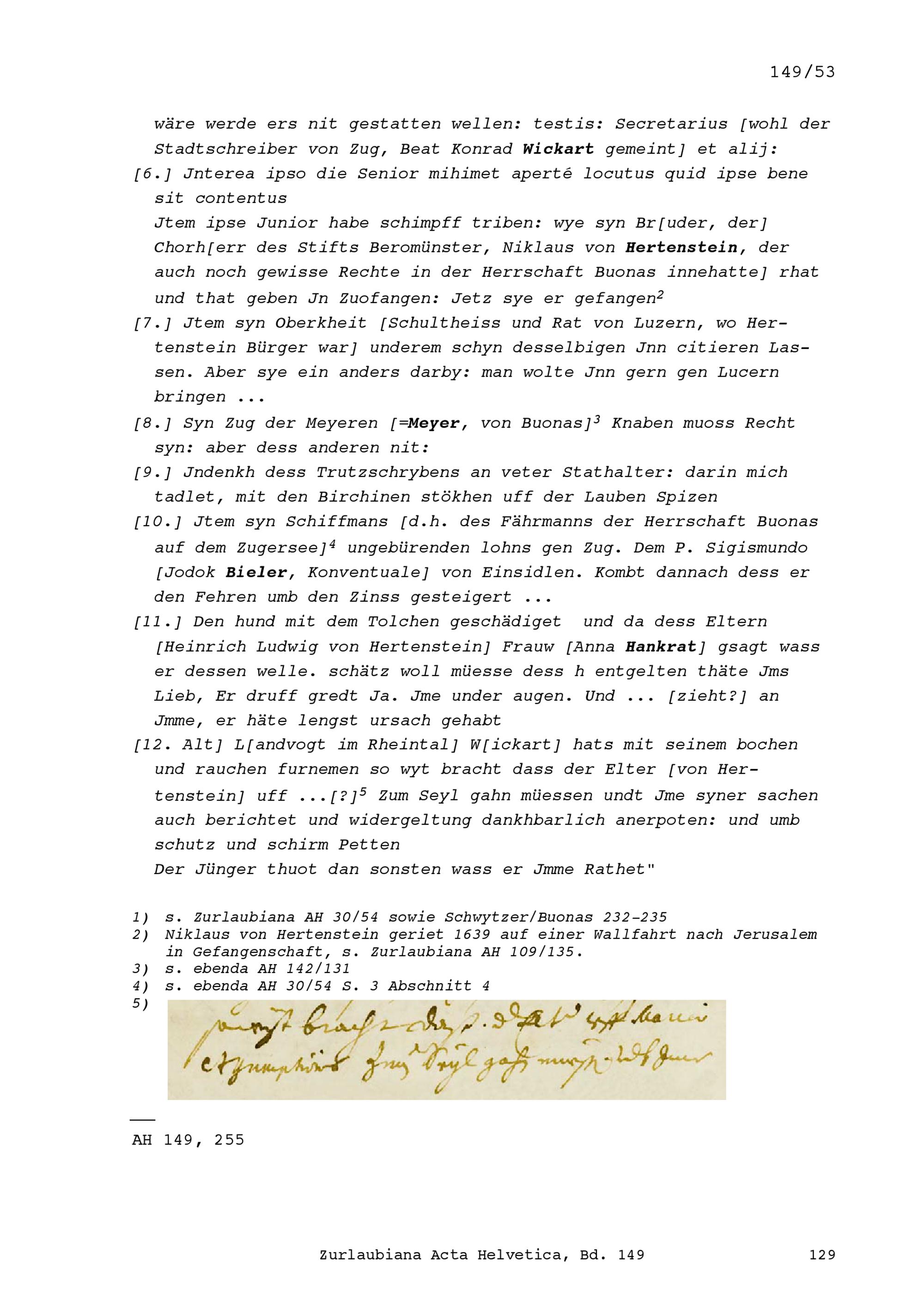 Notiz von Beat II. Zurlauben, Stabführer der Stadt Zug, unter anderem über Wolfgang...
