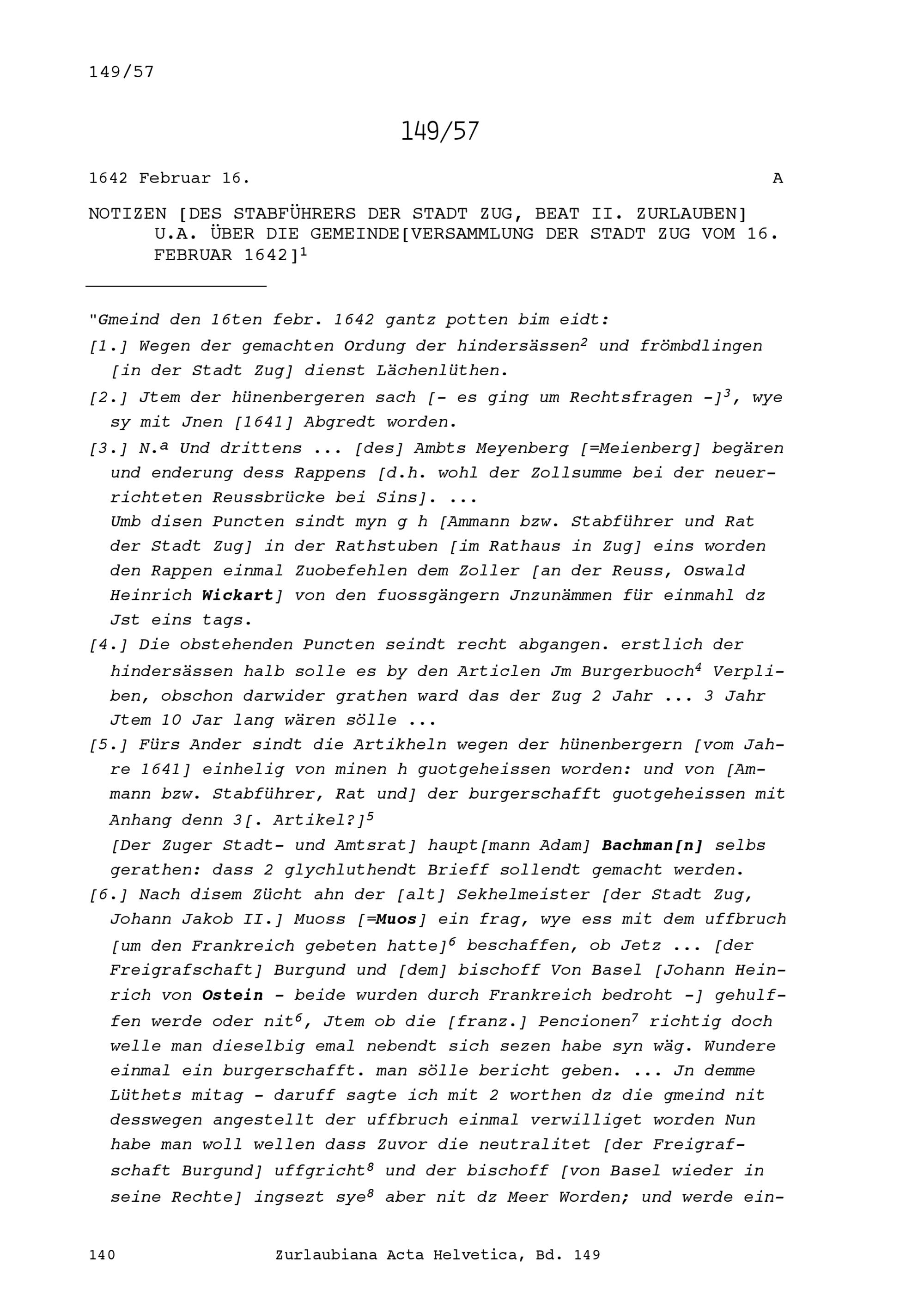 Notiz von Beat II. Zurlauben, Stabführer der Stadt Zug, unter anderem über die Gemeindeversammlung der Stadt Zug vom 16. Februar 1642