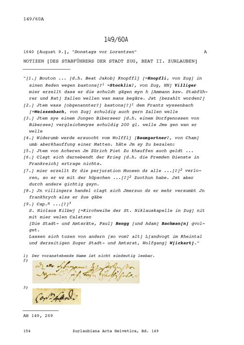 Notiz von Beat II. Zurlauben, Stabführer der Stadt Zug,