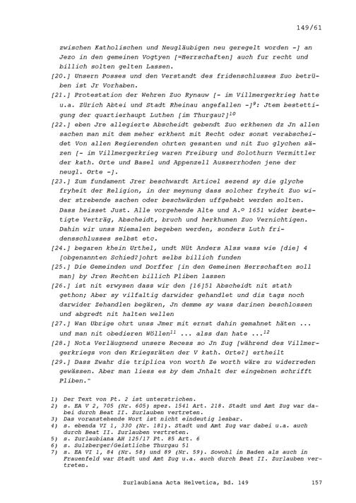 Notiz von Beat II. Zurlauben, Stadt- und Amtrat Zug, in Zusammenhang mit den Friedensverhandlungen nach dem Villmergerkrieg 1656