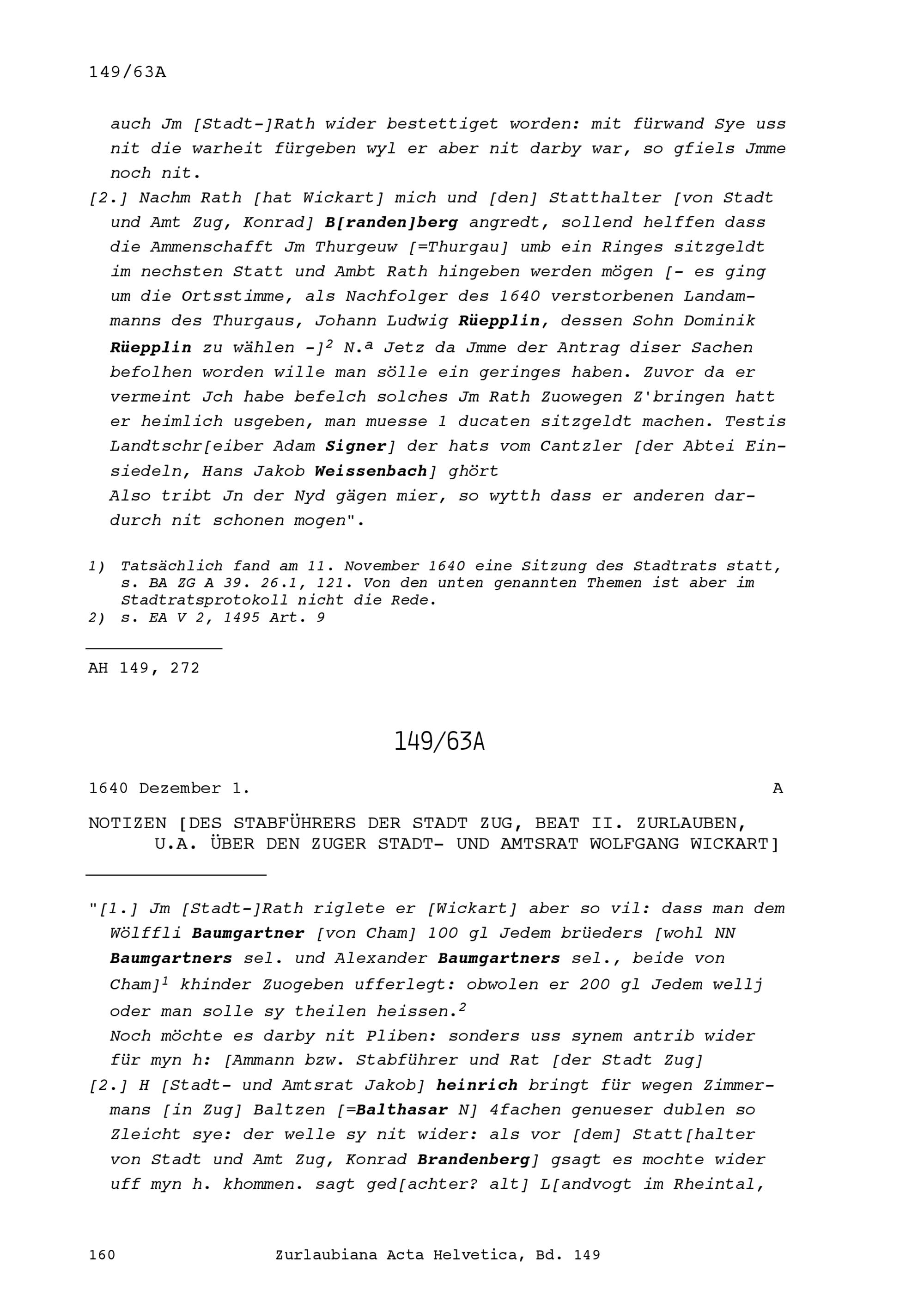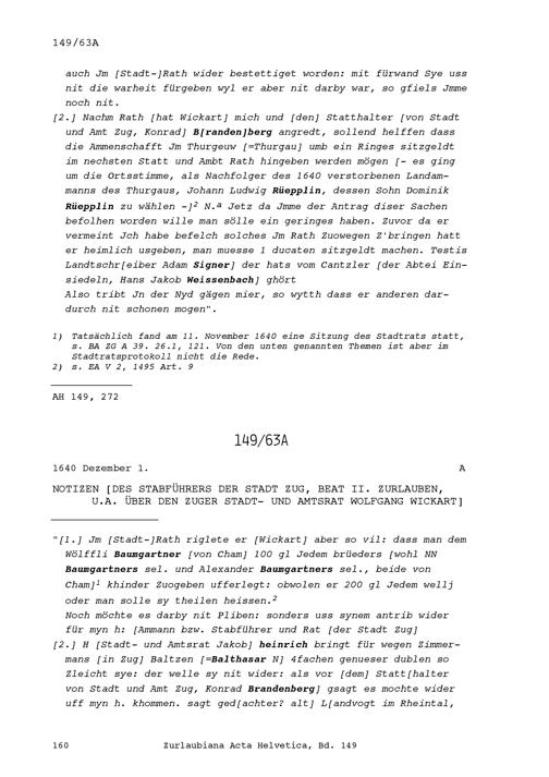Notiz von Beat II. Zurlauben, Stabführer der Stadt Zug, unter anderem über Wolfgang Wickart, Stadt- und Amtrat Zug
